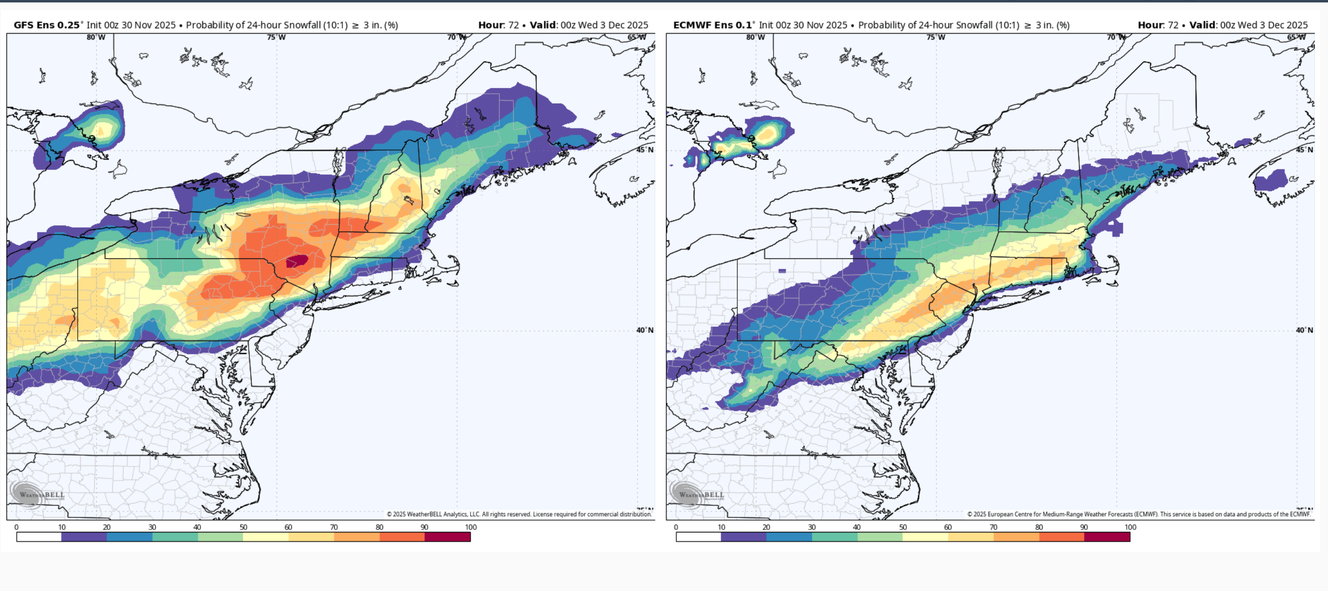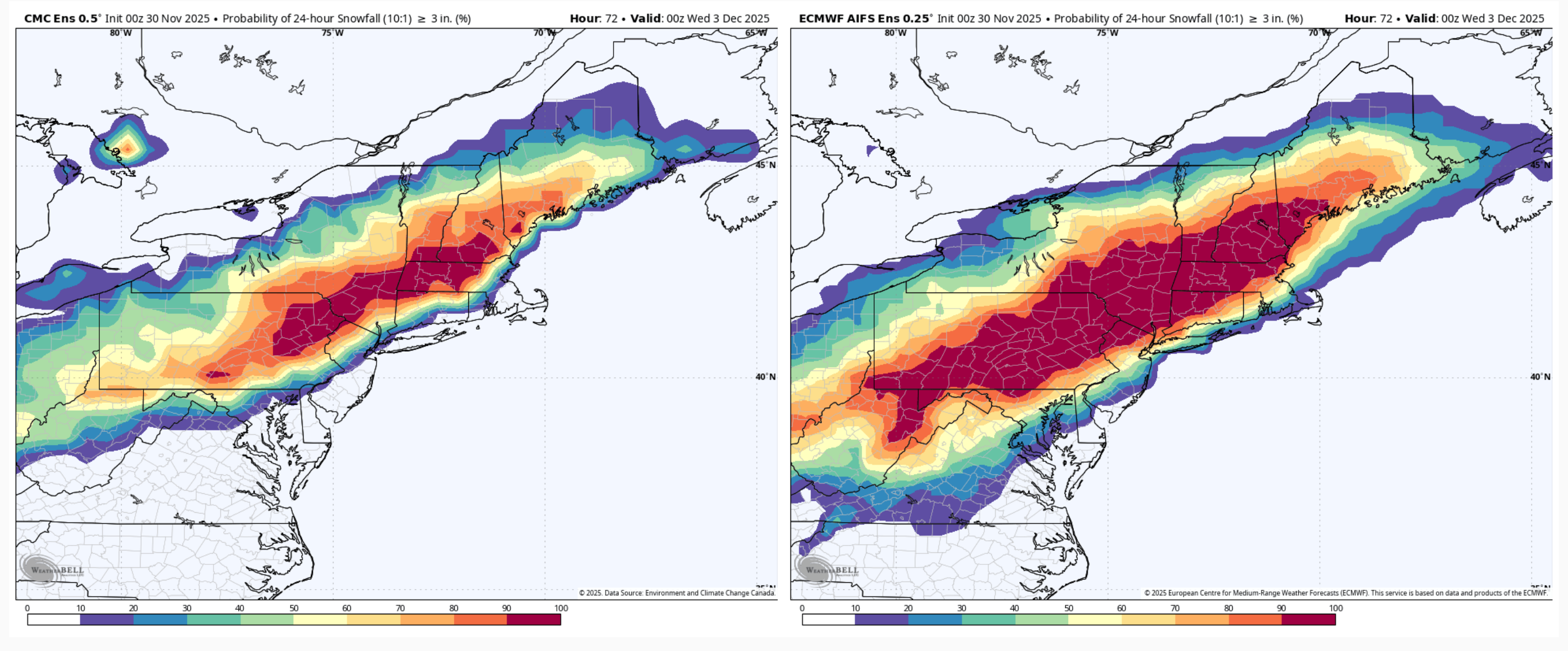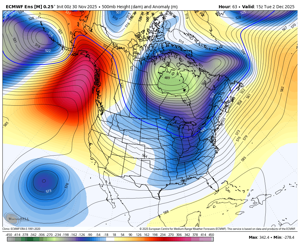 2. Overviewing all the model/ensemble stuff the last few runs I would think most if not all the subforum is looking good for the first widespread synoptic snowfall of the early winter season. I’m not really concerned about any P-type issues except for the LSV near the MD line, and even there I think there’s a good chance of advisory type snowfall or even a mostly snow event presuming we don’t trend the surface low NW much in the next 36 hrs. Think the ceiling in our area is likely to be 5-6” but mostly a 3-5” type event. Main issues I see to sort out at the moment is axis and width of the swath of heaviest snowfall. The regular Euro suite has been a bit more disjointed upstream developing the shield of precip. It seems to be the most progressive of the major stuff to include the GFS and Canadian suites, as well as the AI Euro. This makes for a late blossom of the precip shield over the majority of C-PA and a more focused swath as the coastal low deepens and moves NE. Basically everyone still sees snow but it’s a lot more 1-2” or so with a tighter swath of 3-5” type amounts… which is the furthest SE with that getting a couple inches all the way into DC. It’s reflective in the associated ensembles too. Might as well show them all. 0z GEFS vs Euro EPS 24hr probs of 3”+ 0z Canadian ensemble vs Euro AI ensemble for 24hr 3”+ probs, actually a pretty good match on swath axis The other end of the spectrum is the 3 and 12km NAM being the furthest NW, most wound up solution (no surprise) still as of 6z this morning. I’m sure thats the type of solution the MU guy is envisioning as the end game of what this system does in terms of the boundary being north. Which is certainly possible but I don’t see the amp in the pattern to bend this up in a Chesapeake Bay to NYC to Southern New England trajectory as deep as it has the low developing. And honestly that’s about the only kind of track I would entertain detrimental p-type issues reaching far up into southern PA and the Sus Valley. Otherwise I think this pattern setup we’re in is plenty cold enough to overcome early season climo. Yea the ridge axis is just off the Pacific Coast, but the PV is also anchored over Hudson Bay. Look at the 500mb anomalies for storm time. The only detriment of a +NAO in this setup would be a progessive pattern.