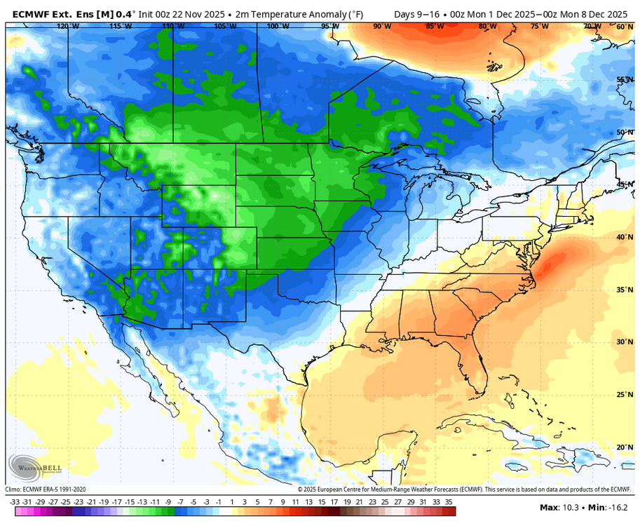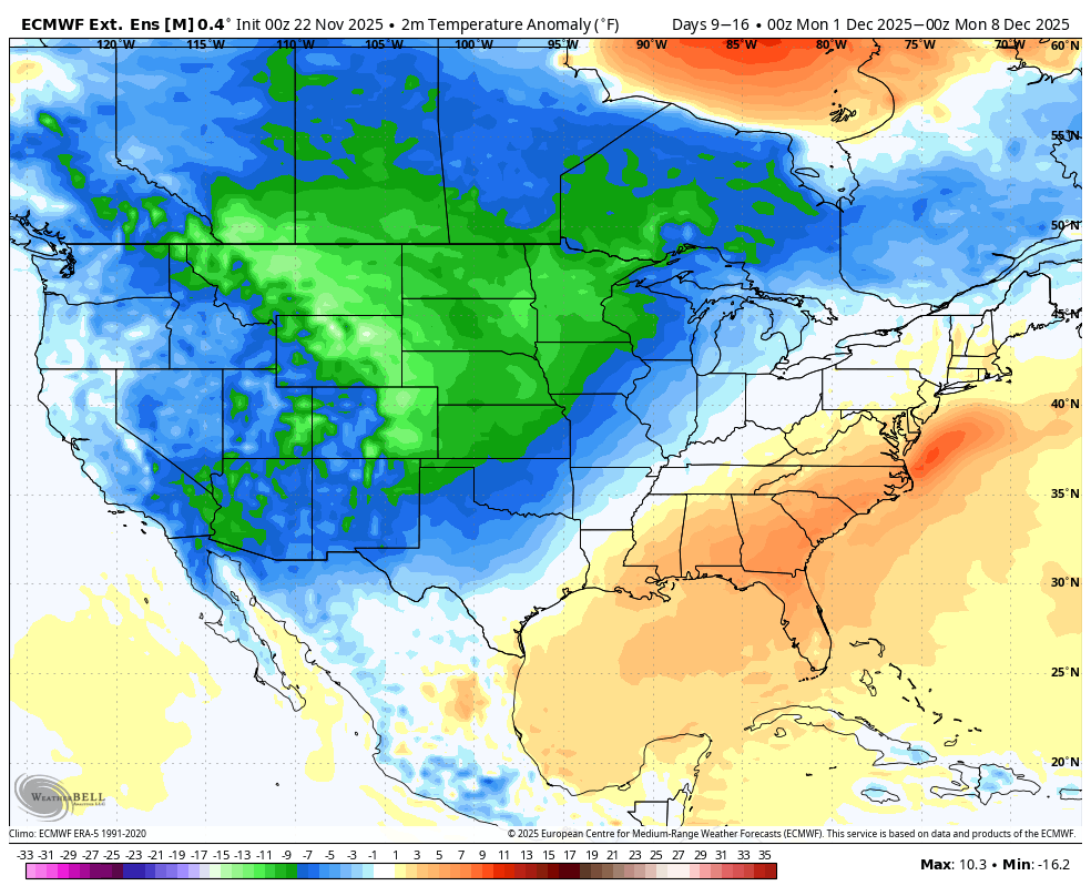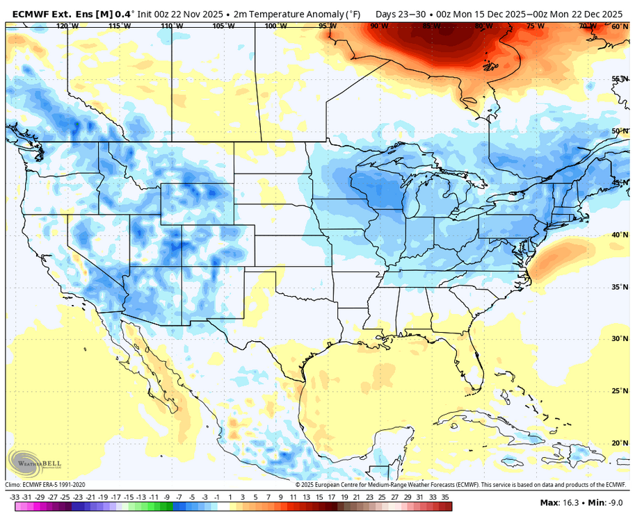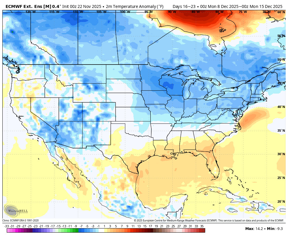 Maybe. The details will/would determine the regional outcome across the sharp gradient I guess. In my experience a ridge through LA, MS, AL, GA, TN, KY usually doesn't work out well except in NNE. To me this looks like a recipe for big snows across maybe the high plains, upper mid-west, or southern Canada. Not much sense in dissecting a 15-day ensemble mean though I guess. At least we're into winter-type "patterns." -