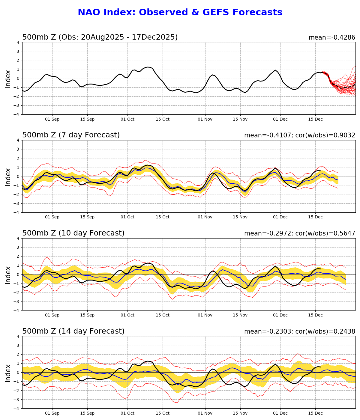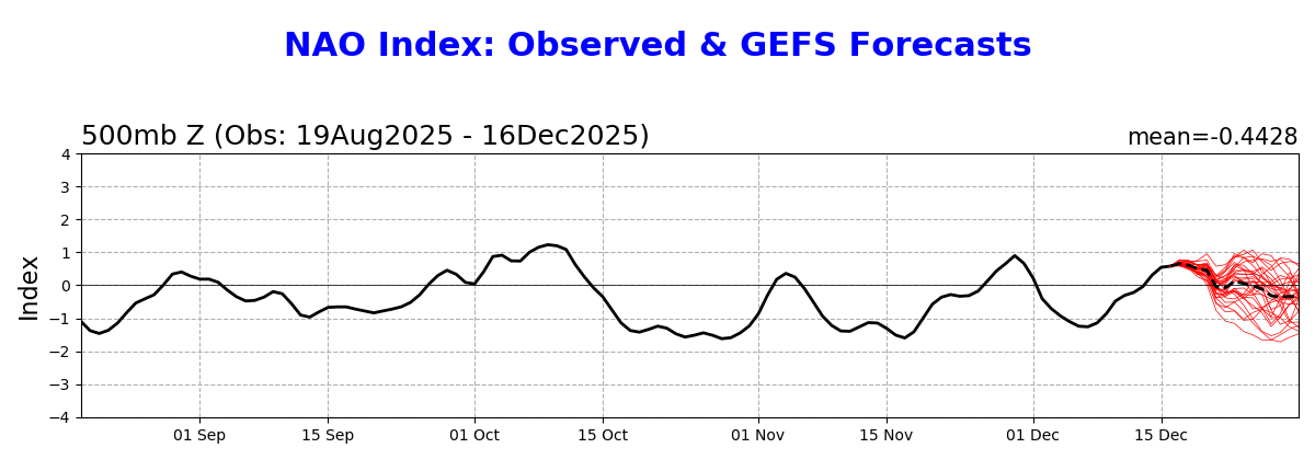 From NOAA, one can see how much the NAO has dropped since just yesterday on the GEFS: Yesterday’s GEFS NAO (12/16); Today’s GEFS NAO (12/17): note the biggest changes are for 12/22-26, only 5-9 days out. Yesterday they were ~0 while today they’re -0.7 to -1.0: