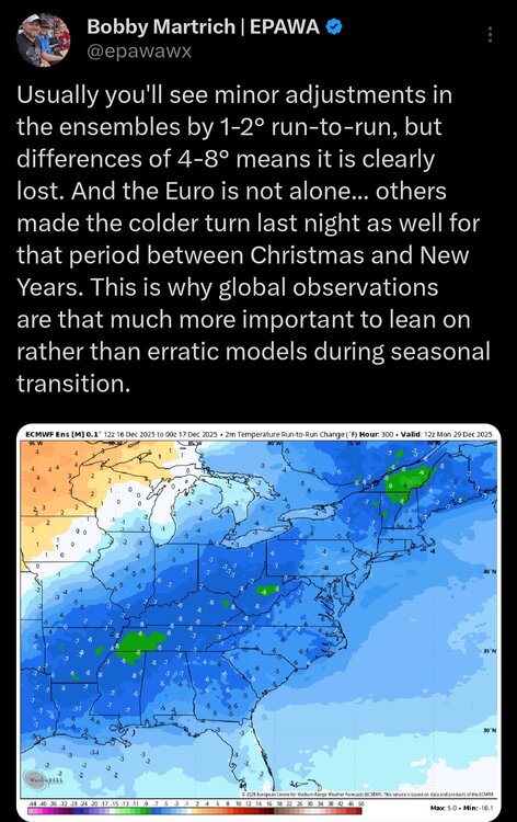 Since we’re in grasping at straws stage, 6z euro AI has a snow/mix event after Xmas. Actually a nice setup and close to something a lot bigger. Interestingly (?), overnight EPS pushes a trough over us in the same time period and retrogrades the pig ridge in the Plains for a few days.