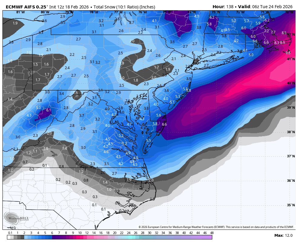 EURO AI doesn't look dissimilar to the other 12z guidance so idk why we toss. I think there is something genuine to say that the AI is never gonna have a run like the CMC since 70" of snow over the Chesapeake Bay has never happened, did so you can hope it's missing some of the intricate details -