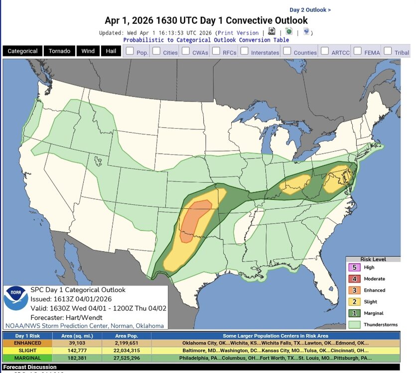 This came out a few hours ago. I don't have rights to the maps or anything lol. https://www.spc.noaa.gov/products/outlook/day1otlk.html -