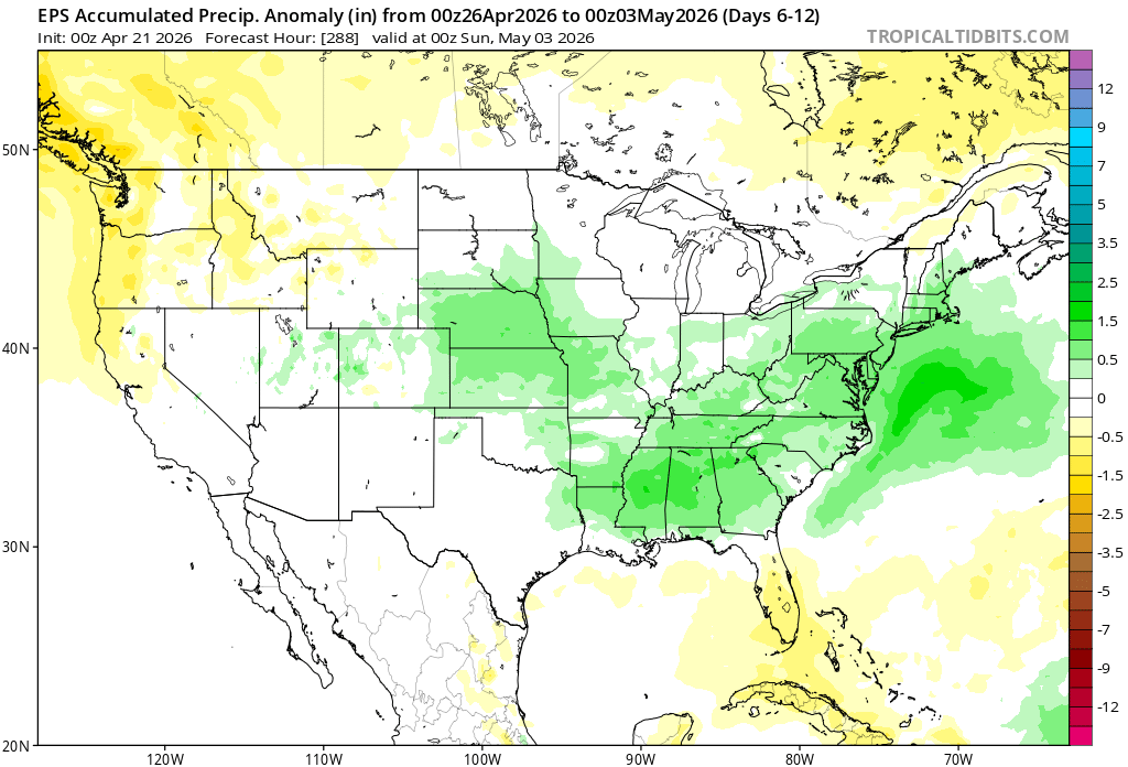 Today’s Euro Weeklies run is the wettest yet for the SE as a whole for Apr 27-May 3rd with ~1.25-1.75” over much of the area! And as an added bonus, the subsequent week (May 4-10) has a bit of a wetter signal than prior runs had: