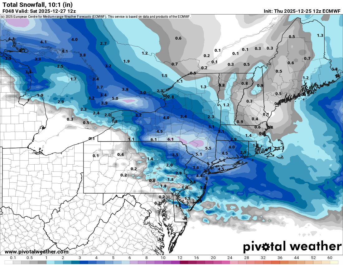 Weakens a bit crossing CT but this would lead to a helluva dump. It just sucks this is going to be in and out. But I am feeling confident much of the state will get 4-8 inches. My map yesterday looks very stupid now. I think the ranges with this will have to be a bit larger than usual because of the cutoff that will occur -