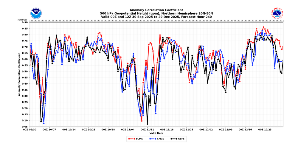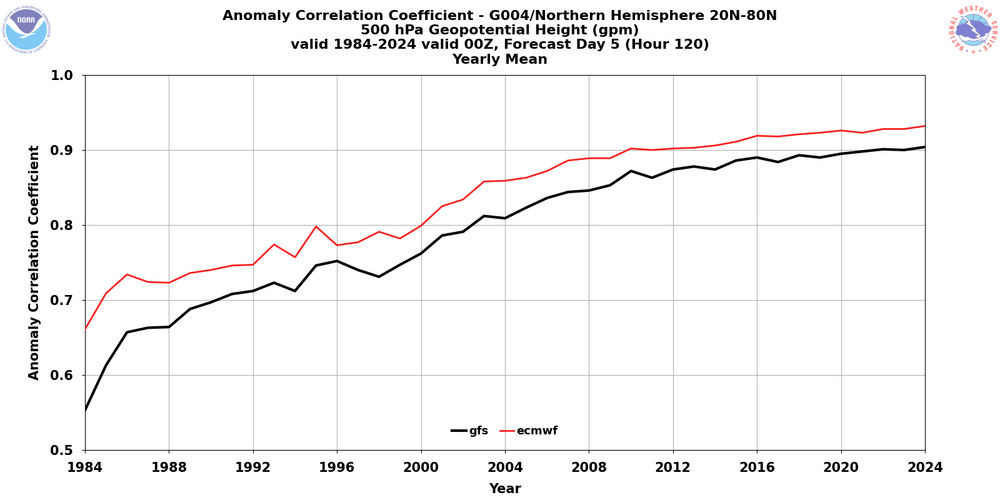 THIS. Even though our resident third graders want to moan that poor forecasts show that NWP is useless, there are certain patterns that for whatever reason just aren't predictable. The fact that all of the major world modeling ensemble systems showed something very encouraging for the end of the first week of January makes it clear that something about those forecasts (initial conditions generally driven by lack of observations or observational errors, the actual equations and parameterizations, numerical methods, or some combo of those) made skillful predictions impossible. But there are plenty of periods where guidance shows remarkable skill even at extended ranges. Here are the 500 mb anomaly correlation scores (the best measure of synoptic pattern success) for 10 day forecasts over the past 3 months for the 3 major ensemble systems (and yes, it only makes sense to verify ensembles at this range). A score of 1 is a perfect score, and the dates on the bottom are the days on which the forecasts verify, not when they're made. There were periods of poor performance by all 3 systems (early October and around November 9), periods of poor GEFS and GEPS performance but with the Euro doing fine (around November 12 and at the very end of December), periods of fair performance by all 3 (mid October), and periods of fantastic performance by all 3 (third week of November and especially the third week of December). Those scores between December 18 and Christmas are remarkable for 10-day forecasts and are numbers we could have only dreamed of 20 years ago. Advances in data assimilation and coupling of the ocean to the atmosphere in models will lead to even bigger improvements, and AI offers tremendous opportunities to run the massive size of ensembles needed to truly represent the uncertainty and potential for extreme events with more lead time. That doesn't mean that frustrations like those with the upcoming pattern will completely disappear, and it REALLY doesn't mean that we should soon expect models to lock in on a snowstorm 12 days out and never waver up until the day it happens. We just need to remember the current limitations and focus on consistency in patterns (and not details of deterministic runs at extended ranges) in ensembles, understanding that progress in forecasting the extended ranges doesn't preclude huge busts. I'll end with this plot of Day 5 anomaly correlation by year over the past 40 years (apologies for not having the values for Day 10). While the lines have flattened more than we'd like in the past 10 years (I think that AI is the way we'll see these rise again), and the GFS needs to catch up to the Euro, the progress is undeniable. Thanks for coming to my TED talk, and Happy New Year! pa