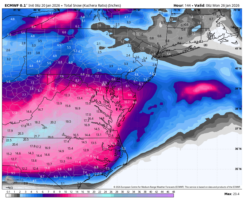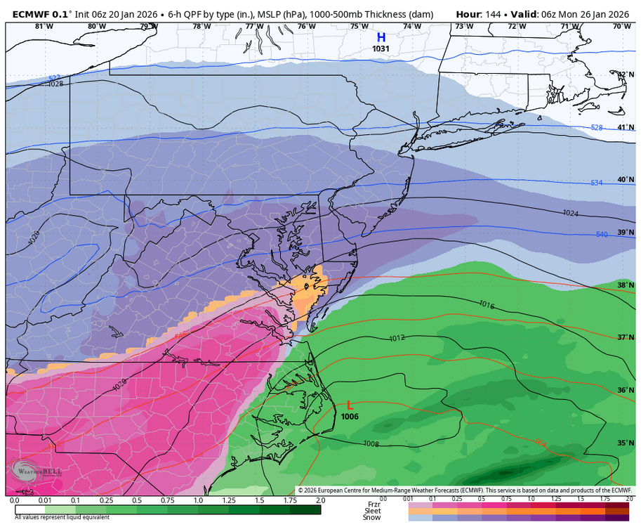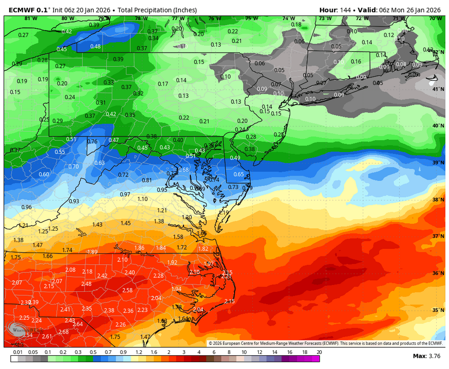 At some point I think ratios are going to matter with this cold. You can clearly see it on the precip maps where we might get less precip but the higher ratios make up for it in snowfall. I think we are any a great spot and if we have a jump north I assume the cold is not as strong and its mostly a wash with accumulations? Euro AI shows only a 2 inch difference between Fredericksburg and Mon county NJ. A distance of 250 miles.