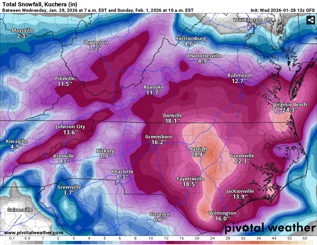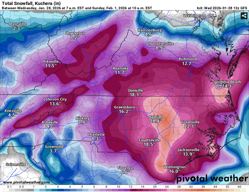 It's probably blasphemy to say that I would be thrilled with 7 inches and let the ENC fellows have the 24 inches that the GFS shows. There are too many problems that come with 2 feet of snow! I know I am a stranded loner on an island by myself with that opinion, lol! -