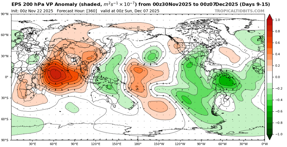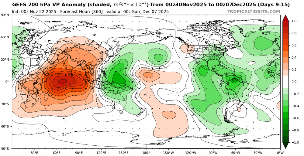 You can already see the model differences between the EPS, GEFS, GEPS at the end of their respective runs. The GEFS and GEPS hold onto the Western trough and Southeast ridge longer than the EPS. It’s probably due to the GEFS and GEPS showing more Maritime Continent forcing longer than the EPS. One of the EPS biases is dampening the convection too much there week 2 and beyond. This is why I like to use the VP anomaly charts over the RMM charts which can follow the convection to the east. One of the features of recent Decembers is a tendency for the forcing to linger in that region than the models originally anticipate. This lingering convection is why it has been so difficult in recent years to get a clean MJO 8 with no convection in that area like we last had in January 2022. So patience is always required this time of year as the pattern change to colder is usually delayed.