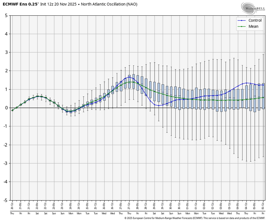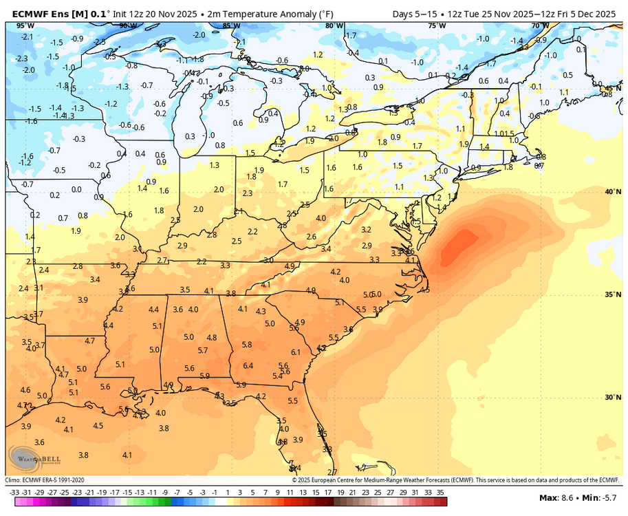 I had a ton of posts up this morning, but as I dug through modeling one thing was clear...ensembles and their deterministic runs were signaling a big warm-up after the Thanksgiving cold. How long does it last? IDK. In a rare move, I deleted all of those posts. Why? When modeling moves in unison towards warm...something is afoot and it usually isn't cold. The MJO argues for a very sharp cold trend in LR modeling which is not present yet. Sometimes, modeling doesn't "see" the MJO until about d10-12. The problem is the MJO really doesn't drive winter weather until Jan/Feb...and maybe late December. Right now, everything is very volatile after d10. Extreme cold is still on the table but kicked to December 8th or later IMHO. Outside of experienced mets, nobody knows what is coming w/ that cutoff low and SSW projected. An amplified pattern appears likely with wild swings between cold and warm. -