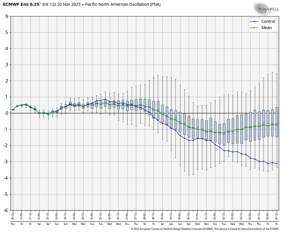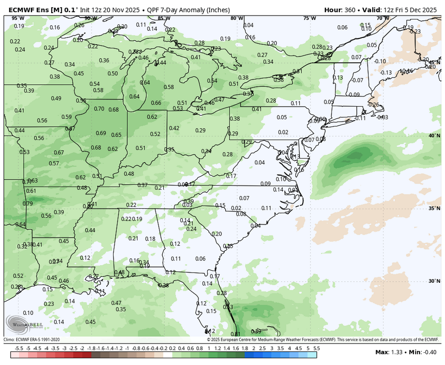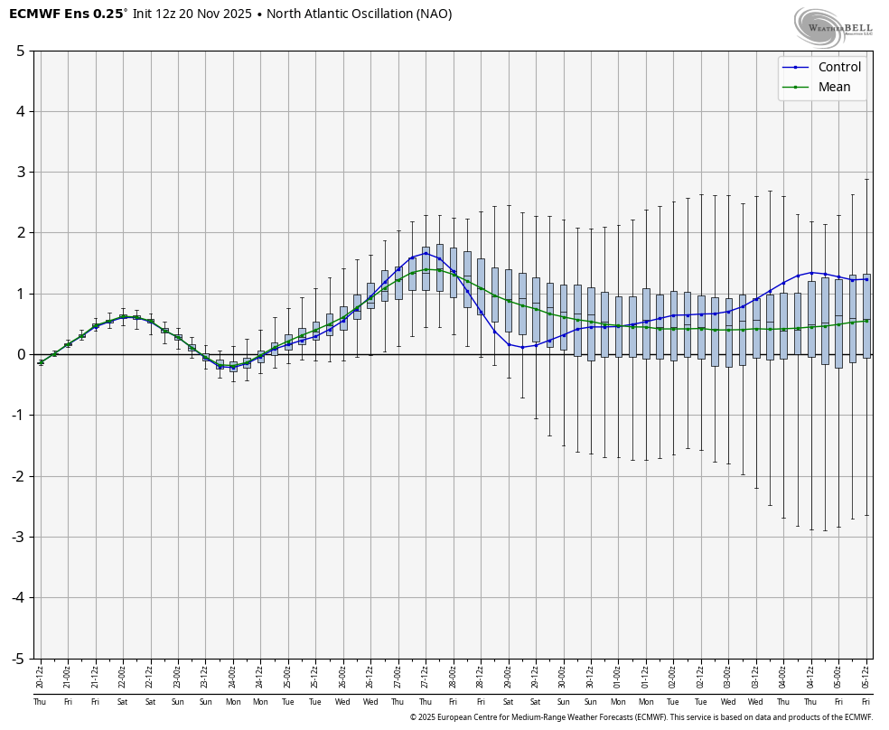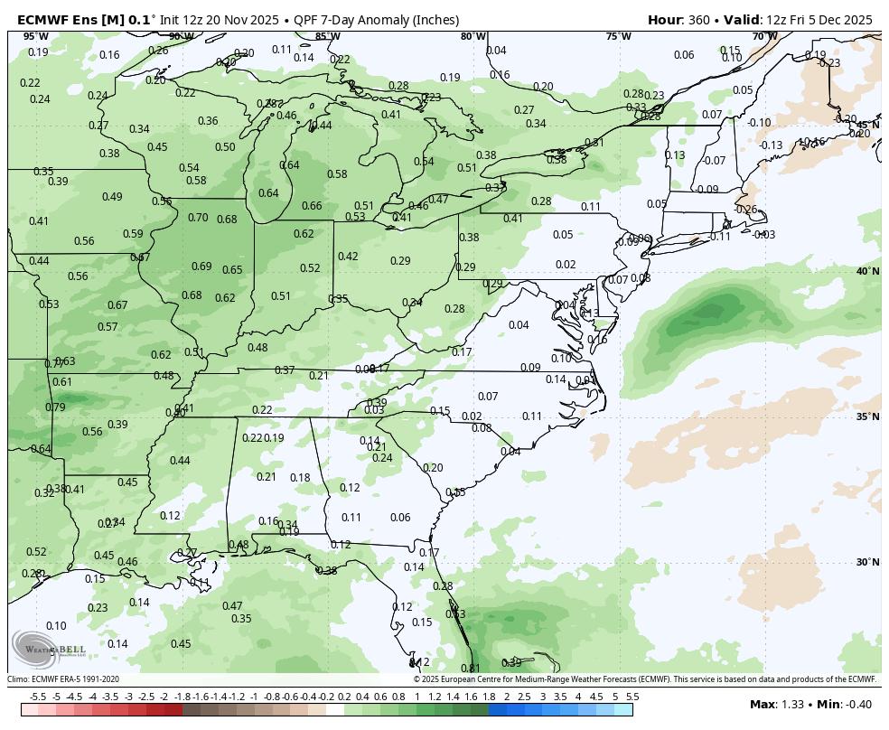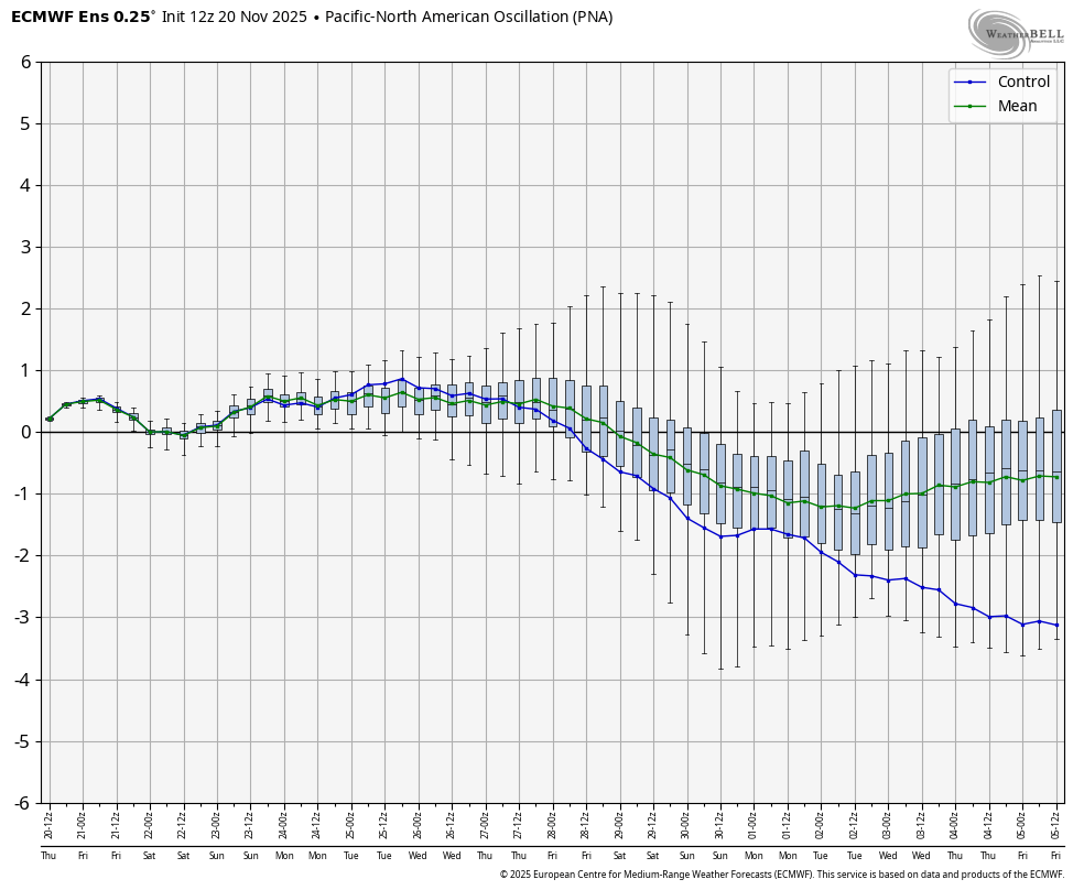 WB latest 12Z EPS: temps average near normal/ slightly above through Dec 5. Precipitation looks like it will pick up toward the end of the period but nothing extreme. Looks like any big storms will track NW of the MA during this time frame with the NAO slightly positive and the PNA slightly negative.