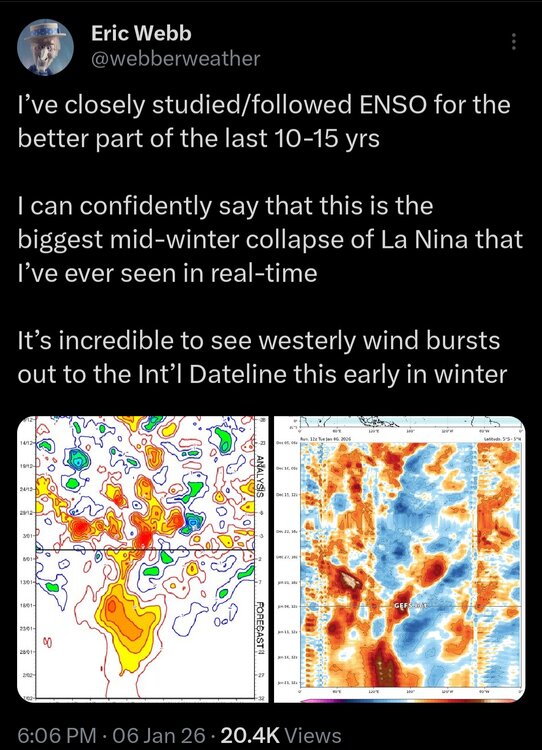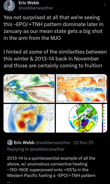 I just counted the # of days in Jans 1975-89 by MJO phase: there are stark differences vs Jans 2011-25 as was suspected:# of days per phase Jans 1975-89 (465 total days)/% of Jan days per phase1: 39 (8%)2: 67 (14%)3: 67 (14%)4: 57 (12%)5: 46 (10%)6: 51 (11%)7: 63 (14%)8: 75 (16%)Compare to this that I posted yesterday:# of days per phase Jans 2011-25 (465 total days)/% of Jan days per phase1: 17 (only 4%)2: 26 (only 6%)3: 67 (14%)4: 51 (11%)5: 57 (12%)6: 101 (a whopping 22%)7: 104 (a whopping 22%)8: 42 (9%)So, what changed the most in Jan when comparing 1975-89 to 2011-25?# of 8-1-2 Jan days dropped sharply# of 6-7 Jan days rose sharplyJan 1975-898-1-2: 39%6-7: 25%Jan 2011-258-1-2: 18%6-7: 44%So for Jans when comparing 2011-25 to 1975-89, the # of 8-1-2 days dropped way down from 181 to only 85 (drop of 96 days) while the # of 6-7 days rose sharply from 114 to 205 (rise of 91 days)! Phase 8 went from having the largest # of days of any phase Jan 1975-89 to having only 40% of the largest # of days of any phase Jan 2011-25! A quite possible explanation is the PDO cycle in conjunction with the strong W Pac warm pool. So, if the mean PDO would go positive, maybe Jan MJO dist. will revert back to 1975-89. Then again, the strong warm pool may be mainly due to CC?? If so, would it be easily reversible with a PDO change? A lot of this would seemingly be hard to answer. @donsutherland1@bluewave@40/70 Benchmark@snowman19