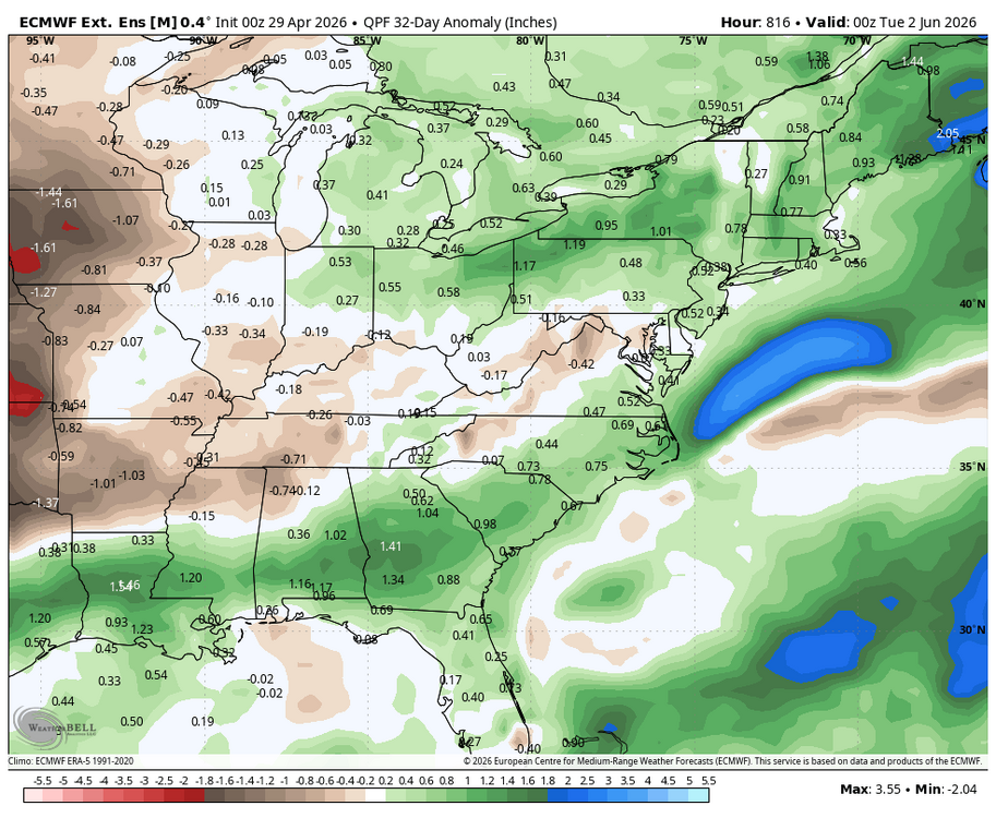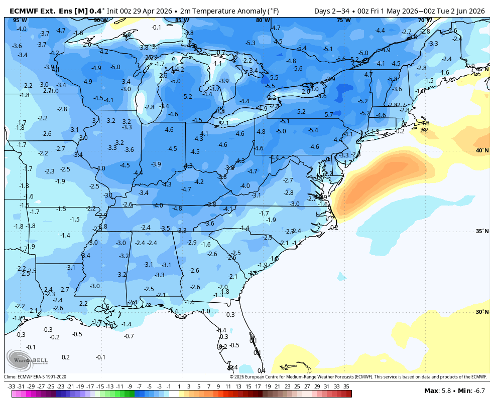 March here was +1.8. April will finish at +1.1. Since 1999, April has averaged 44% of available sunshine. April 2026 will have exactly the same. Precip will finish about 1/2" BN - we're at 0.5"-0.6" from the current event and the best is past. Yesterday's forecast of 1-2" for today was optimistic. Month is finishing close to normal.