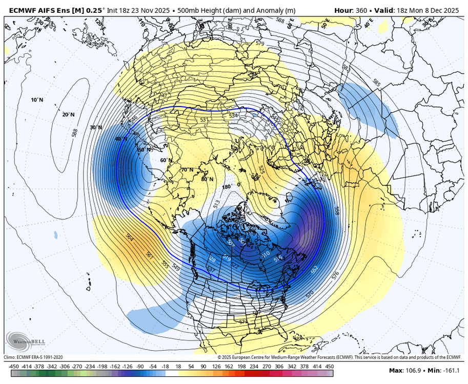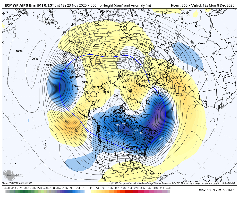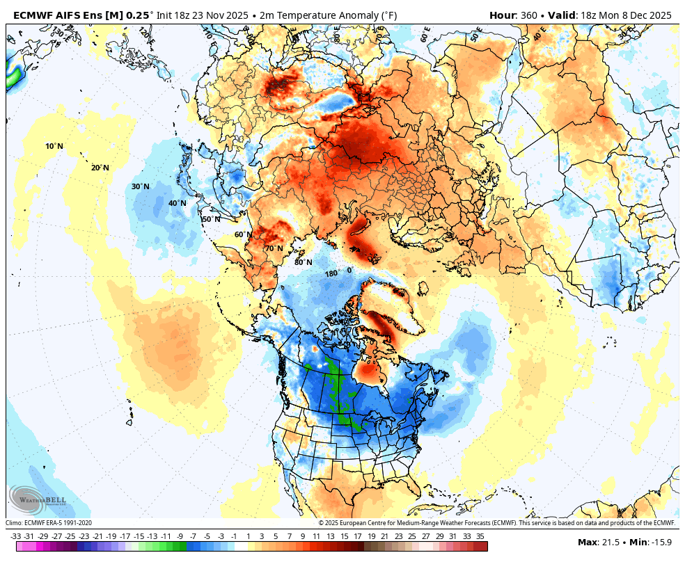 WB 18Z AI EPS at Day 15. I see this as the glass half full rather than half empty; lot of cold air in the Northern Hemisphere to play with come the second week of December. Relax, enjoy Thanksgiving with your families this week, and count your blessings.