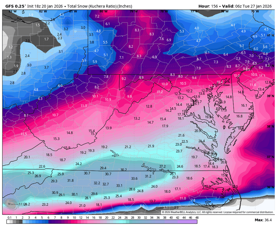 Dayum...from an inch or maybe two at 12Z, to a foot-plus in the DMV! The 10:1 ratios are still on the order of @stormtracker's baseline of 6-10" area wide.