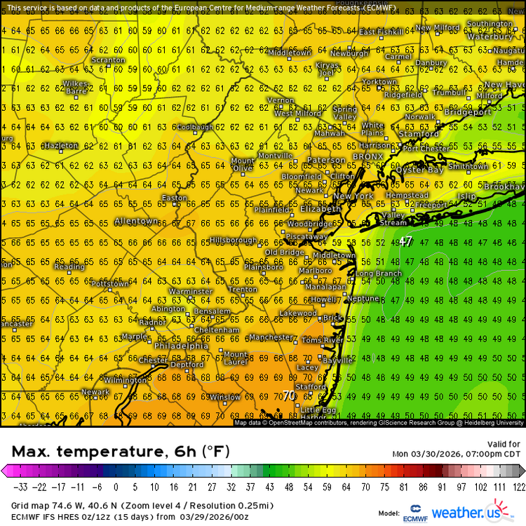 The warm spots like New Brunswick have a chance at another 1-2 March days reaching 70° and could get close to 2012. Time Series Summary for New Brunswick Area, NJ (ThreadEx) - Month of Mar Number of 70° days Click column heading to sort ascending, click again to sort descending. 1 1945 11 0 2 2012 8 0 3 1946 7 0 4 2026 6 3 - 1921 6 0 5 2016 5 0 - 1989 5 0 - 1948 5 0 - 1913 5 1 - 1910 5 2 - 1903 5 0