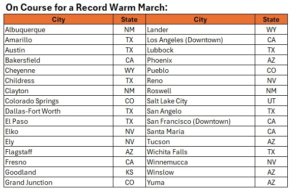 UHI, which is an important contributor, has been mentioned in several of the past Phoenix-related threads. Even setting aside, UHI, there has been a strong warming trend in Arizona and the Southwest. During 1970-2025, Arizona's minimum temperatures have warmed an average of 0.6°/decade. Phoenix's have increased by 0.8°/decade. In terms of maximum temperatures, Arizona's rate of warming has been 0.7°/decade while Phoenix's has been 0.8°/decade. The differences are a reasonable but not perfect proxy for the impact of UHI. The ongoing March heat is widespread. The following stations with 100-year or longer climate records are on course for their warmest March on record. Some will break their existing records by sizable margins.