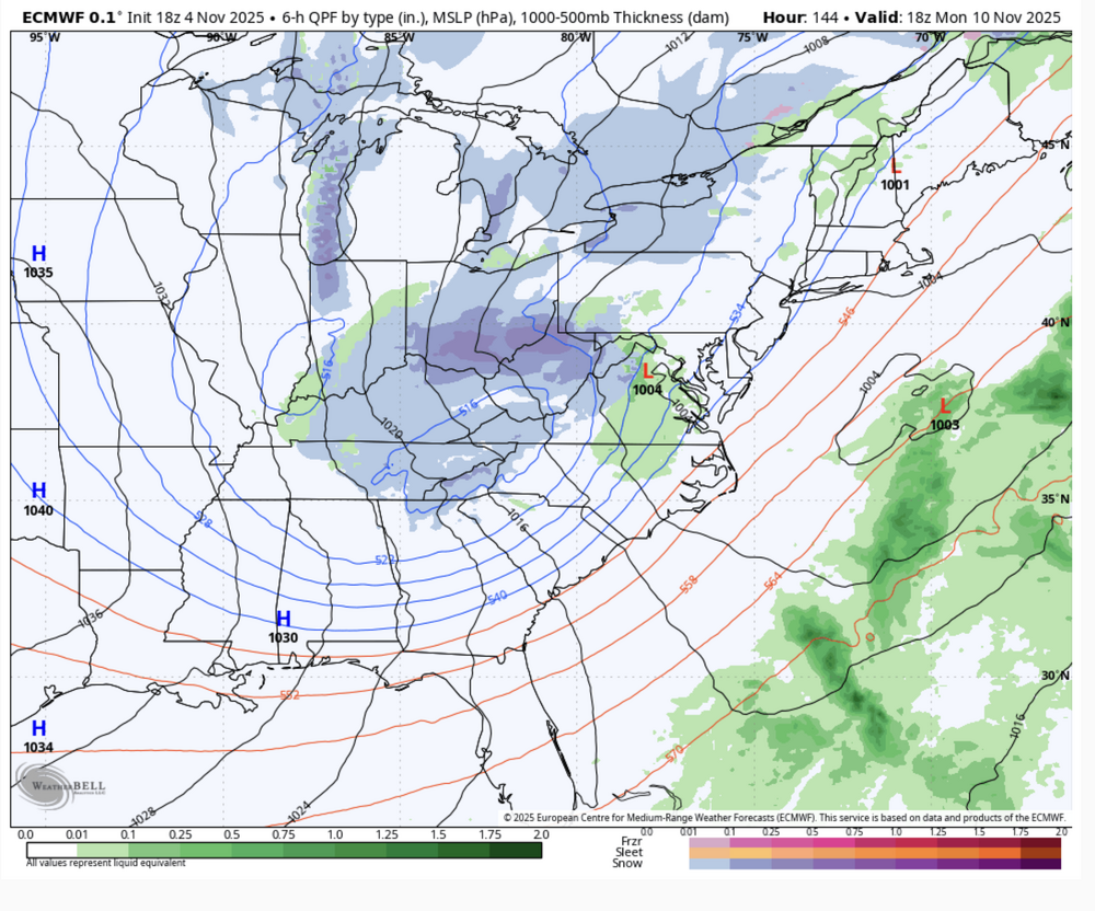 The BTV NWS has been going with about half those amounts in their past couple of updates, but you can see they’re using the “For now” qualifier in their wording, so they’ll get a bit more aggressive as we get closer if need be. Area Forecast Discussion National Weather Service Burlington VT 636 PM EST Tue Nov 4 2025 .SHORT TERM /WEDNESDAY NIGHT THROUGH THURSDAY/... Snow level should lower 1500ft agl by Thursday morning. For now, the forecast shows a slushy dusting to a inch around 1500ft, 1 to 3 inches from 2000 to 3000 ft, and 3 to 5 at summit level at Mt. Mansfield and Jay Peak. Either way, it should be another round of snow on top of what’s there from the weekend system. The Friday/Saturday system continues to look like the warmest of the lot with less opportunity for snow, but they are already talking about the Sunday/Monday system as having the potential for snow down to the lower valleys, so certainly an opportunity for more accumulation. .LONG TERM /THURSDAY NIGHT THROUGH TUESDAY/... The next system for Sunday-Sunday night looks like the more interesting one for snow lovers as a rain to snow event is possible as a longwave trough develops with its axis over the Great Lakes region.