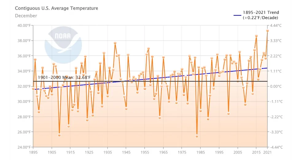 Based on population weighted heating degree days, a good measure of energy usage, the Conus won’t be warm at all! Pop weighted Dec temps are progged to come out to only ~1 F warmer than normal. My estimate is for Chicago to end up Dec 3 BN, Cinci 2.5 BN, Balt. 4.5 BN, Philly 4 BN, NYC 5 BN, and Boston 4.5 BN. Even the upper SE (NC) should come in slightly BN and then ~+1.5 at ATL. SL should be right at normal. DFW should be ~5 AN, DEN ~11 AN, Phoenix 6.5 AN, LA 3 AN and Seattle 4.5 AN. Based strictly on geographic area though, my guess is that the Conus will come out to ~3 AN for Dec (~1 BN E 1/2 and ~7 AN W 1/2) or ~37 F. If it comes out to 3 AN, that wouldn’t be anywhere near the records of 2021 (~5 AN or ~39.3 F) and 2015 (~4.5 AN or ~38.6 F.