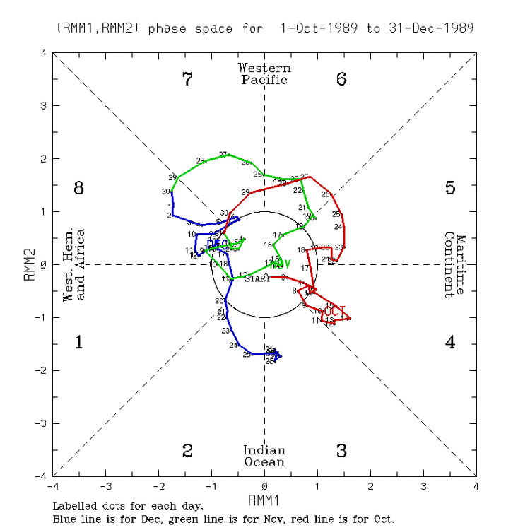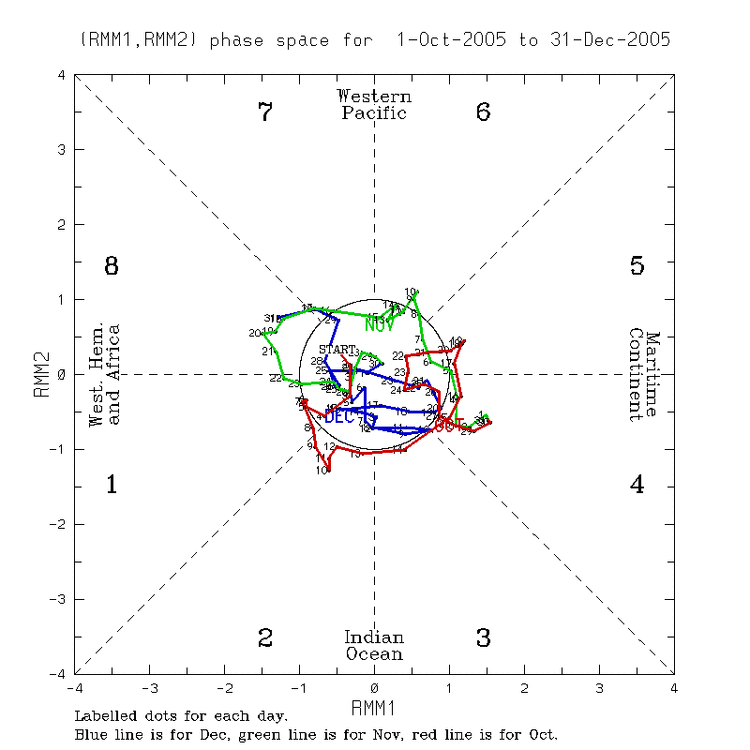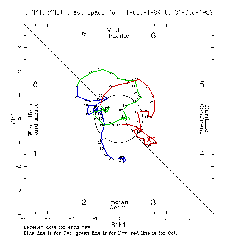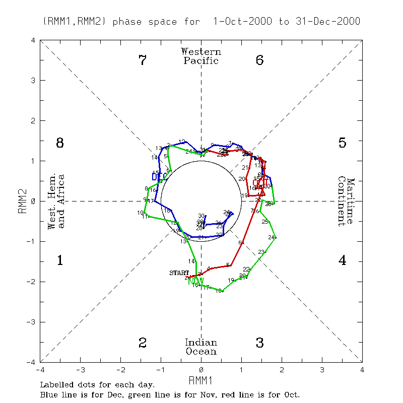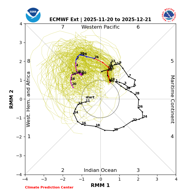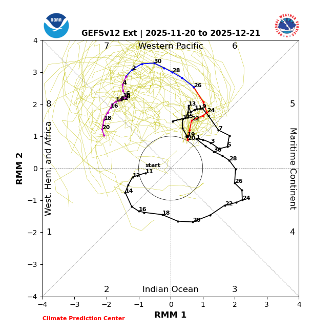The 6 coldest La Niña to neutral ENSO Decembers in the E US as a whole since 1974 have been 1983, 1985, 1989, 2000, 2005, and 2010: Here are the respective Dec MJOs: 1983: mainly inside COD or just outside/no strong 1985: almost all inside COD 1989: most of 8/1 just outside COD or inside it/no strong 2000:almost all just outside or inside COD 2005: all inside COD 2010: all just outside or in COD What do these 6 have in common regarding the MJO? No strong and most just outside to inside COD. Below are the extended progs that have the Dec 1-21 MJO: look how strong they are, especially GEFS but even the Euro is solid compared to the six cold Decembers posted. My concern is that the MJO amplitude will be too strong, based on history, to allow for a widespread intense cold dominated E US in Dec. My hypothesis as to why strong MJO has had a tendency (though not always, of course) to not be as cold as weaker MJO is because the higher amp May tend to bring up too much warmth from the tropics, where the MJO is measured: Any opinions?