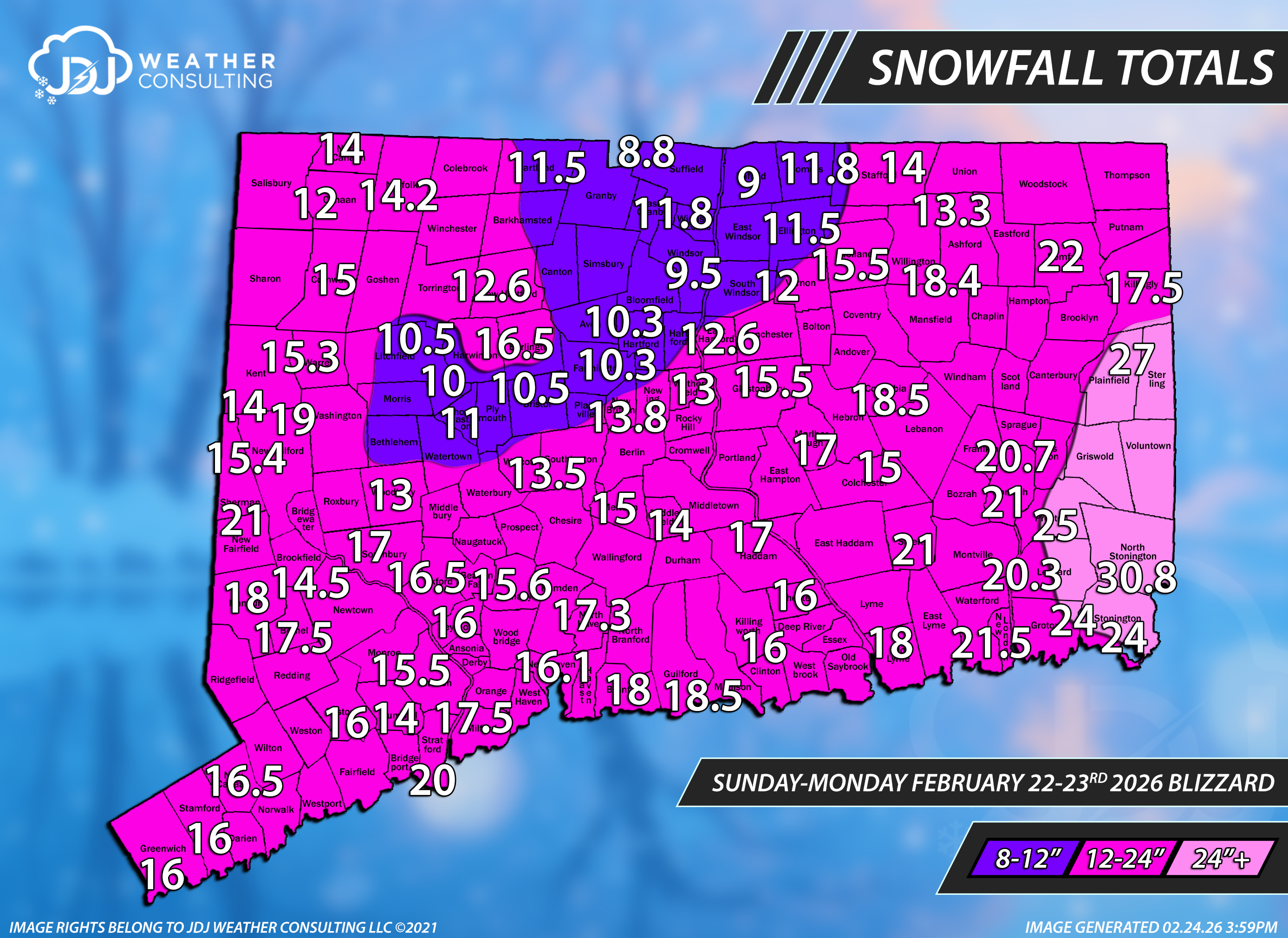 This is a first pass - initial snowfall totals for CT only. Will be working on SNE/Tri-State for the next couple days, it's going to be quite a project to say the least. Thanks to everyone who sent reports, i tried to use most of them if i could fit them in. This CT one will get updated with different ranges but used the original ones for verification purposes. Overall feel very good about the final call forecast, at least for Connecticut. Some higher amounts greater than 2 feet occurred in SE New London and eastern Windham counties. Feeling an A- for the grade for CT.