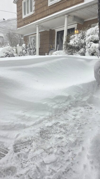 For an 8:00 am reading, currently 30 with dp 30 and persistent SN. Finally climbed through the tundra to get to the board (which is on a table) and what was there was taller than the 12" ruler, so got a 2nd one to get 13.5". The Ryan Hall Y'All look-alike snow ruler that I had adjacent to the board, had snow that drifted to almost 17" (I had sprayed it with teflon spray to at least minimize wet snow plastered against it). I did remember that 10 years ago, I bought a 4ft aluminum T-square that I had used to make some replacement dresser drawer bottoms, so dug in the basement to find that and try it. It was difficult to find an "open" place to sink it (my back patio is poured concrete with strips of ground on either side) but both my lilacs are completely bent over onto what open center patio area there was, so readings there would be skewed. Still, it ended up sinking to at least 12" - 13" in multiple spots (and I left it out there). I cleared most of the board (that I could get to) and will see what comes next. Time to buy an old-fashioned wooden yardstick. -