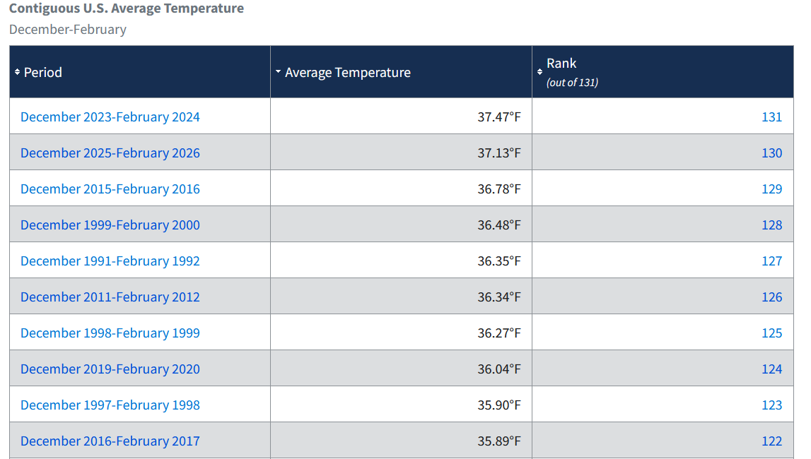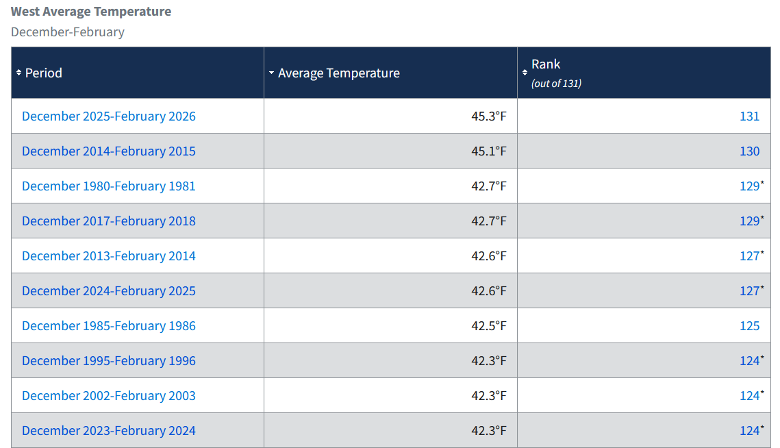 The last three winters have all ranked among the 10 warmest in the West: A disproportionate share of top 10 warm winters in the West and nationwide have occurred since 2000: The Great Lakes and Northeast were fortunate to have a cold and snowy (especially in the Northeast) winter. Such winters can still occur, and likely will occur for decades to come, but they have become notably less frequent on a nationwide basis. -