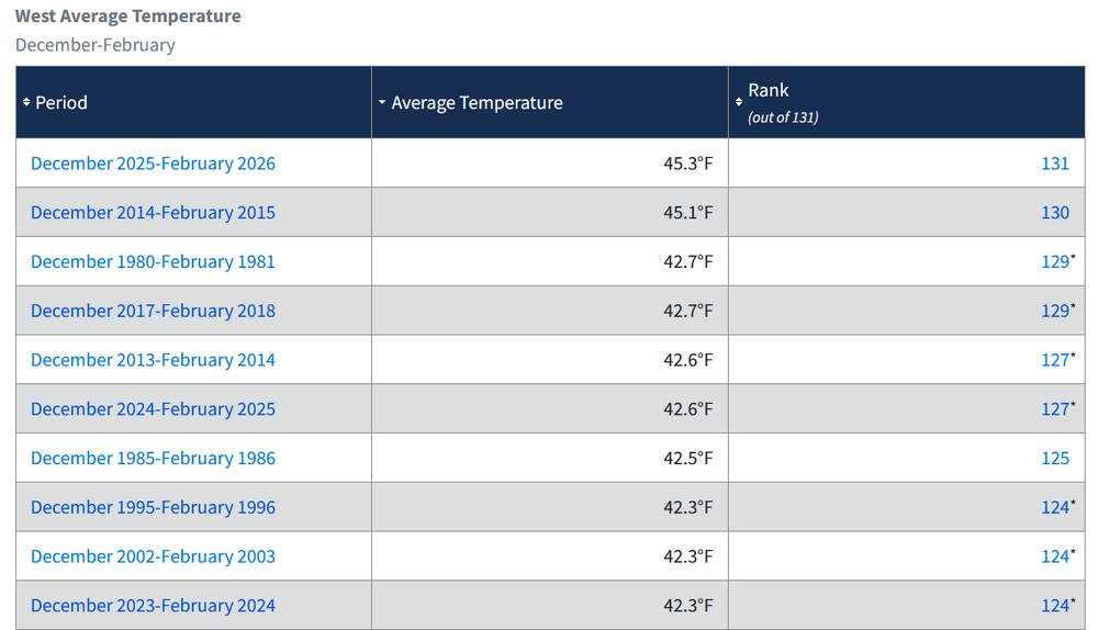 Not to downplay how bad things are out there right now because they are bad but it’s going to end up being a huge anomaly in the end. Didn’t you guys just have a string of good winters the last decade? I know 22-23 was cold in the west for sure. It’s not like some switch was flipped and now this is the “new normal”. When March 2012 happened over here after a warm and snowless winter, I read a couple of articles about how this was going to happen more because of climate change. Well, no surprise to me, nothing even close to that has happened since. Or how about the “permanent” Texas drought I kept reading about in the early 2010s? Next thing you knew it was flooding there.lol.