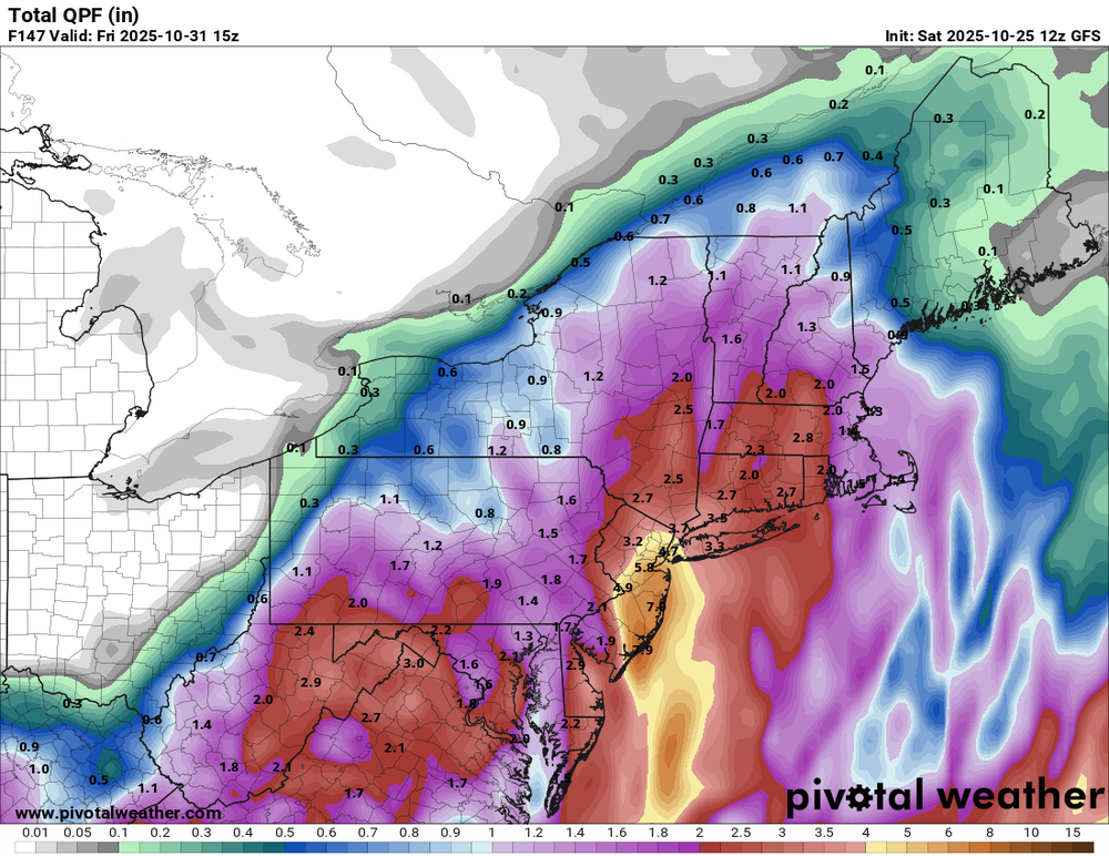 The GFS and GGEM have moved into good agreement about the potential for a significant or perhaps even major rain event for the closing days of October. Rainfall for the 48-Hour Period Ending 10/31 12z for NYC: 10/24 18z GFS: 0.0" 10/25 0z GFS: 0.0" 10/25 6z GFS: 1.5" 10/25 12z GFS: 4.7" 10/25 0z GGEM: 0.5" 10/25 12z GGEM: 4.3" While the excessive amounts are far from certain, the general idea of a potentially widespread significant or greater rainfall is the key takeaway. The kind of powerful block in place under which a trough is trapped can lead to some big precipitation events.