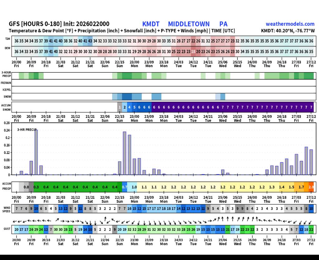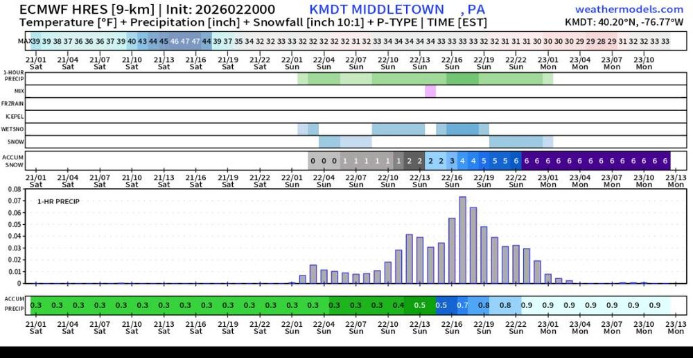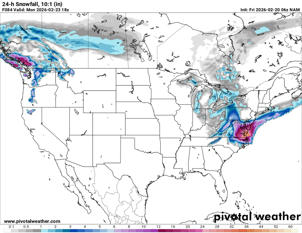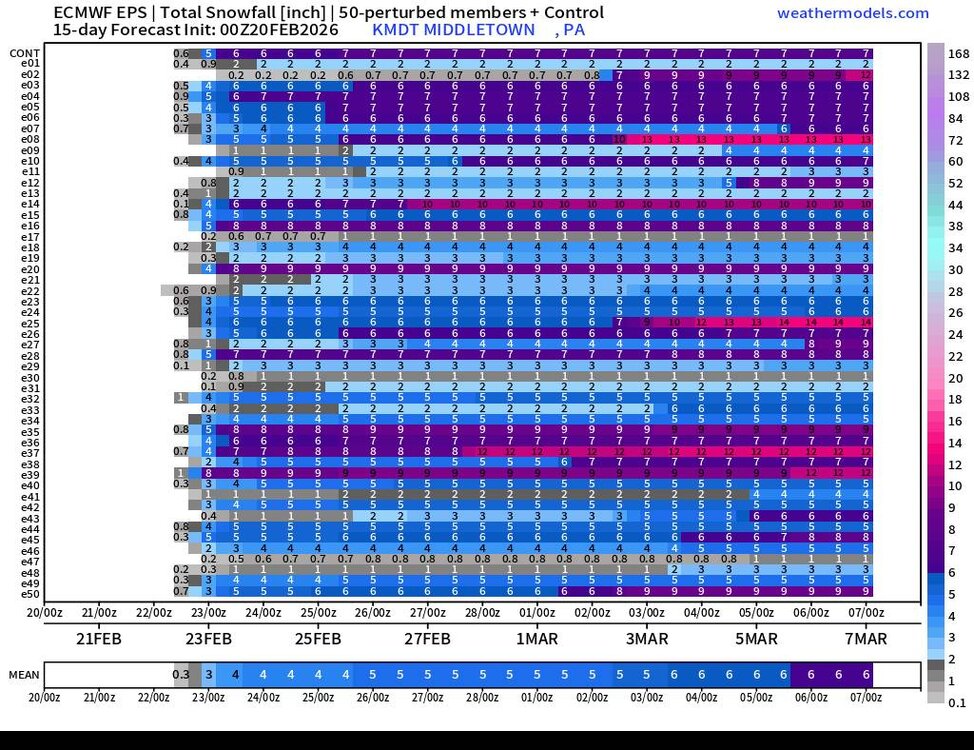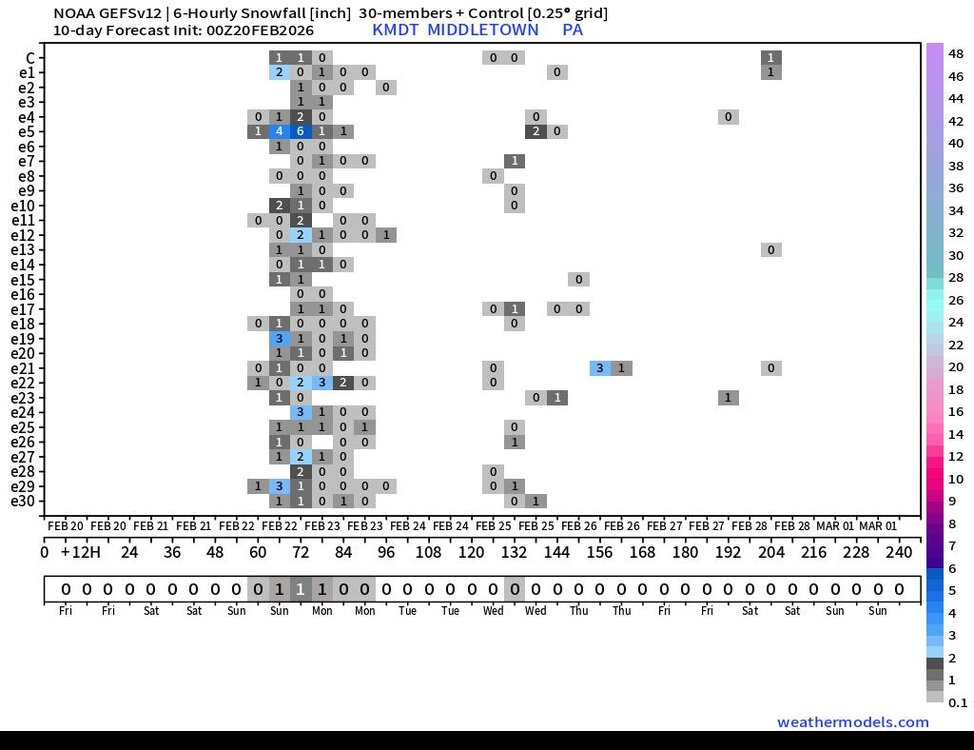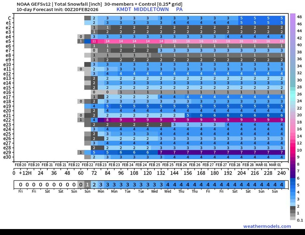 10. thinking 4-8 right now. we’ve got most of the ingredients for a big one (50-50, cold enough air, well positioned trough and divergence, multiple pieces of energy). it’s not cold enough for good ratios though and no blocking means this thing is flying. that’s my 1am take