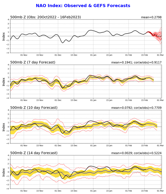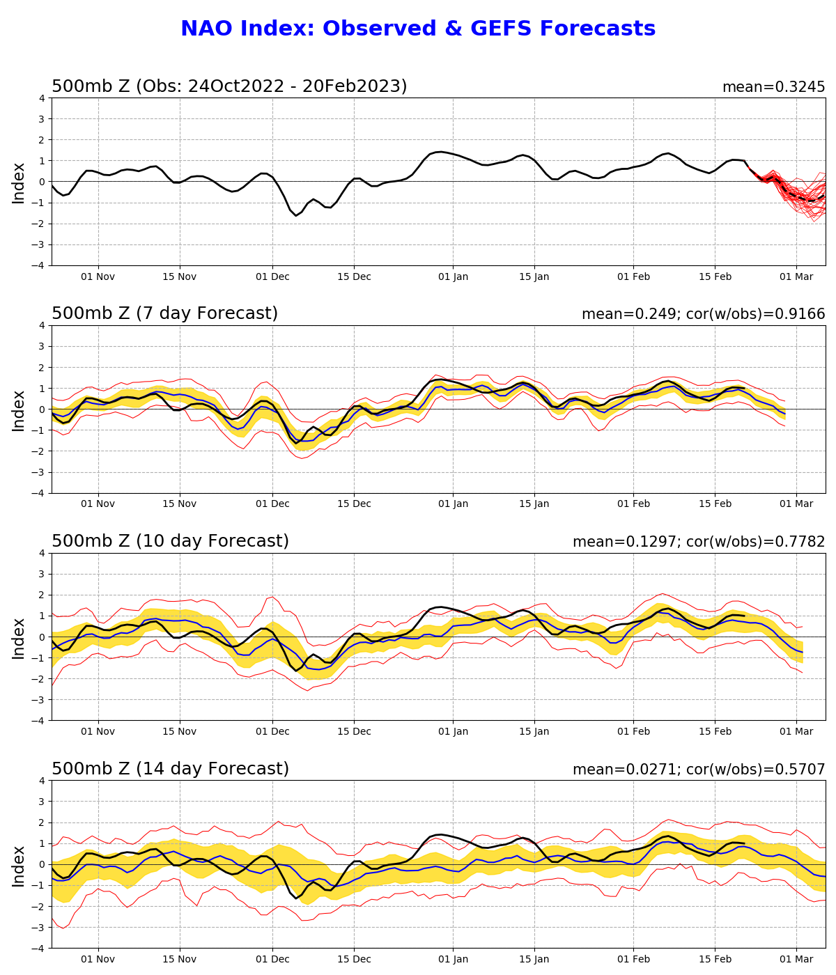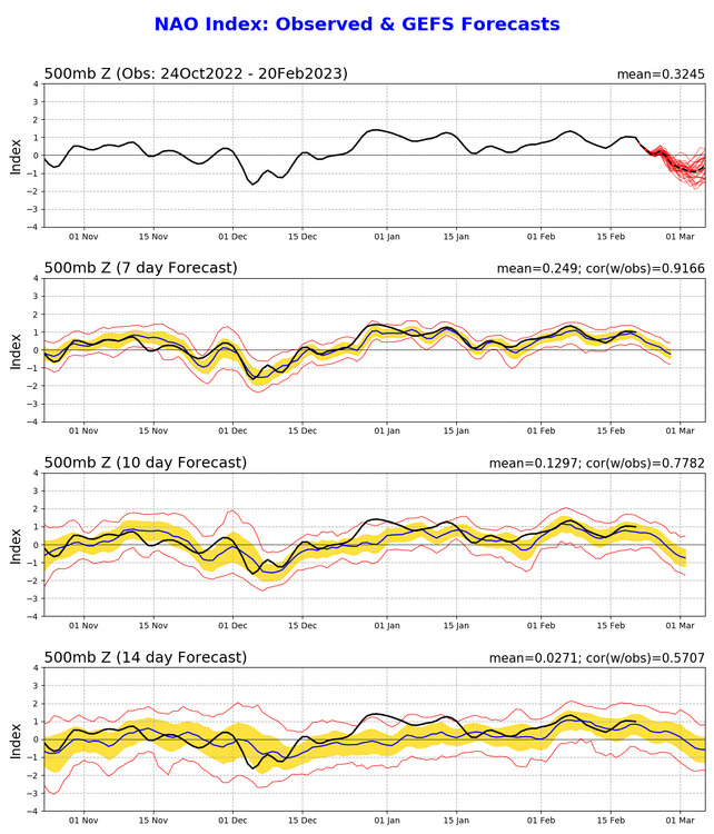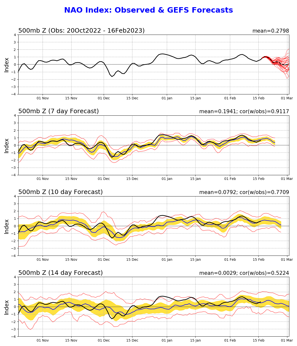 I agree 100% about the realistic possibility that the models have been slow to react to a more -AO/-NAO as potential effects of the current SSWE. Why? I have to look no further back than the 2/16/2023 major SSW. Even on the run of the day of the actual strat. reversal the GEFS was still clueless about the impending drop of the NAO late Feb into mid March: 2/16/23 (day of SSWE) GEFS NAO forecast through 3/2/23 was dead neutral (0) through 3/2/23: Actual daily NAOs: look how the GEFS run from the day of the SSWE was way too positive for Feb 26th-Mar 3rd! 2023 2 16 0.918 2023 2 17 1.051 2023 2 18 1.202 2023 2 19 1.122 2023 2 20 0.775 2023 2 21 0.480 2023 2 22 0.330 2023 2 23 0.157 2023 2 24 0.155 2023 2 25 0.047 2023 2 26 -0.301 2023 2 27 -0.742 2023 2 28 -0.748 2023 3 1 -0.956 2023 3 2 -1.006 2023 3 3 -1.093 2023 3 4 -1.161 2023 3 5 -1.109 2023 3 6 -1.132 2023 3 7 -1.187 2023 3 8 -1.091 2023 3 9 -0.614 2023 3 10 -0.356 2023 3 11 -0.293 2023 3 12 -0.254 The next day and the following days, the GEFS started catching on and had this just 4 days later (2/20/23), which was much closer to what actually happened: this was through Mar 6th: Similar trends happened with the AO. The moral of this real-life story? Stay tuned for more potential big NAO/AO drops for mid December! Daily NAO: https://ftp.cpc.ncep.noaa.gov/cwlinks/norm.daily.nao.index.b500101.current.ascii @donsutherland1