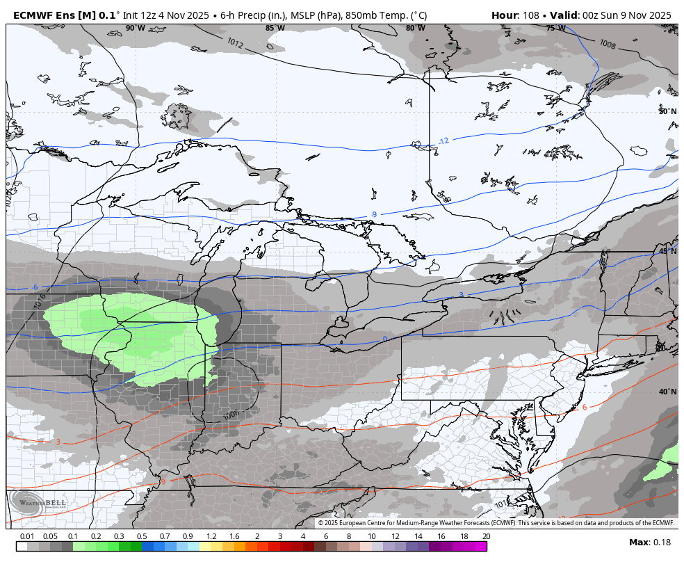It doesn't last long because the Pacific is moving way too fast right now, but a nice pattern amplification this weekend into the beginning of next week. You can see the chunk of the PV at the beginning of the loop up in the middle of the arctic circle that drops towards Hudson Bay this week and gets pulled into the Great Lakes and New England Sunday through Tuesday. It will be impressively cold aloft beneath this, so the lakes will be cranking. Pretty good chance that there's enough snow to prompt at least winter wx advisories off a few of the lakes, usually when it's as cold aloft at 500mb as what the models are depicting and the lakes are this warm there are some intense bands. -