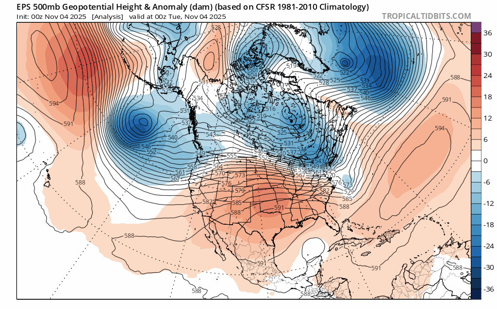 Tomorrow will be a mild day with highs reaching the lower 60s. A weak cold front could touch off a few scattered showers. It will turn increasingly windy following the frontal passage. Winds will likely gust past 50 mph for several hours. Highs will then fall back to the lower and middle 50s Thursday and Friday before milder conditions return for the weekend. Afterward, there is the potential for a short but sharp cold shot, possibly preceded by a chilly rain. Lows would fall well into the 30s in New York City while highs struggle to reach the middle and upper 40s. The ENSO Region 1+2 anomaly was +0.1°C and the Region 3.4 anomaly was -0.6°C for the week centered around October 29. For the past six weeks, the ENSO Region 1+2 anomaly has averaged -0.05°C and the ENSO Region 3.4 anomaly has averaged -0.52°C. La Niña conditions will likely continue through mid-winter. The SOI was +17.81 today. The preliminary Arctic Oscillation (AO) was +1.343 today.