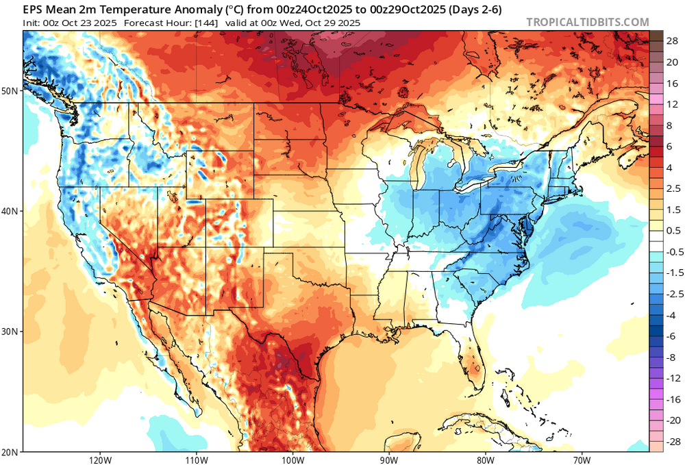 Strong blocking regimes often result in cooler than normal conditions, even at this time of year when wave lengths are shorter. The strongly negative NAO is having an influence. The NAO has now been at or below -1.000 for six consecutive days and is forecast to remain between -2.000 and -1.000 through the rest of the month. Select Mean Temperature Data for October 22-31, 1980-2024: NAO -2.000 to -1.000: 51.0° All Other Cases: 55.0° 1980-2024 Mean: 54.3°