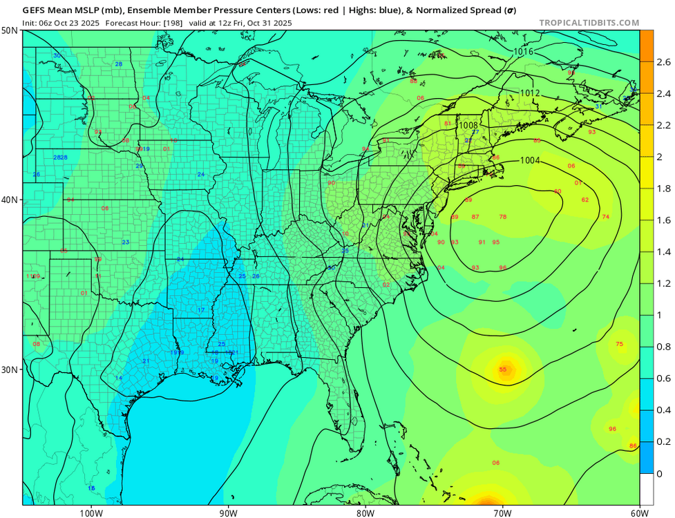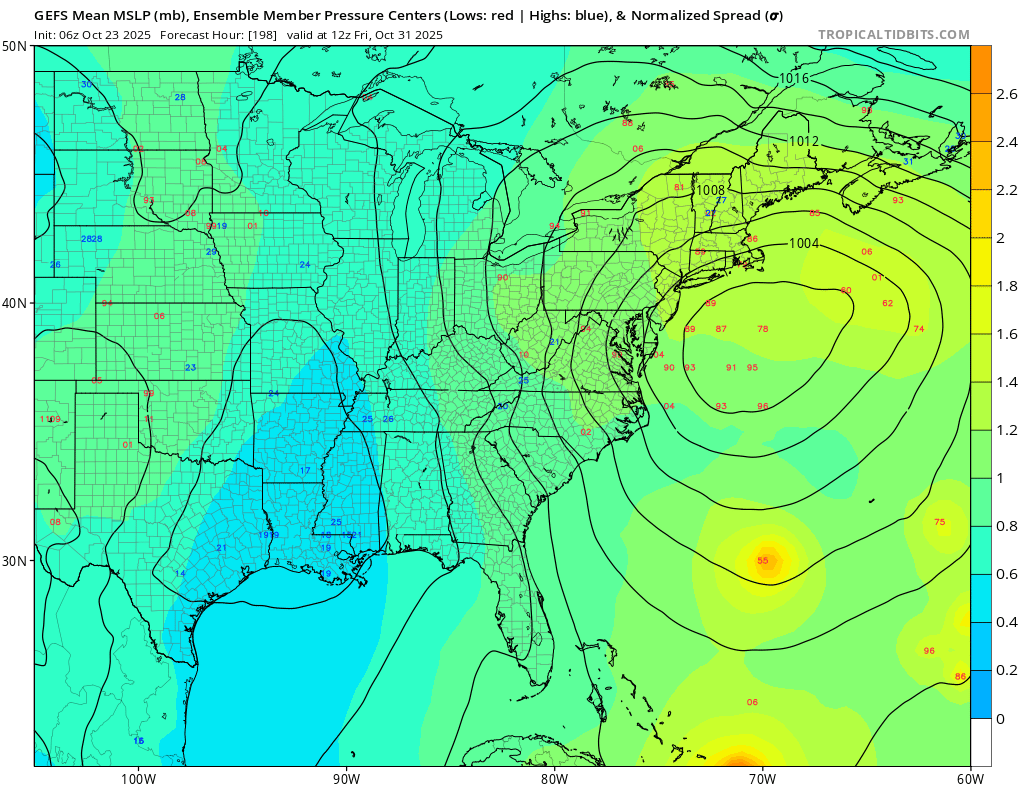 echoing the general sentiment... but, TC entanglement was never likely. It was in fact unlikely (... but even a long shot can give the addicts a dopamine pop. Ha ha). The emerging consensus explains why that is. No issues with letting that go. With that said, there is still a signal for an EC impact/ Nor'easter, regardless of those noisy GGEM solutions. Mainly upper M/A and NE this go. In fact, the GGEM got hugely distracted somehow and ventured off from ... every form of modelling technology I can find last night and isn't used. Wildly divorced from consensus. Meanwhile, the GFS and Euro being well below 980 mb under deep forcing kinematics, fits both ens means, and the numerical telecon deltas. Circumstantially, whilst there's lingering +PP hanging over N of Maine like that. Heh, bit of a high surf/coastal flood enthusiasts 'wet' dream (see what I did there) Also, a lot of rain over terrain enhancing along the inevitable CCB axis. Kind of a 'scary' setting for Halloween -