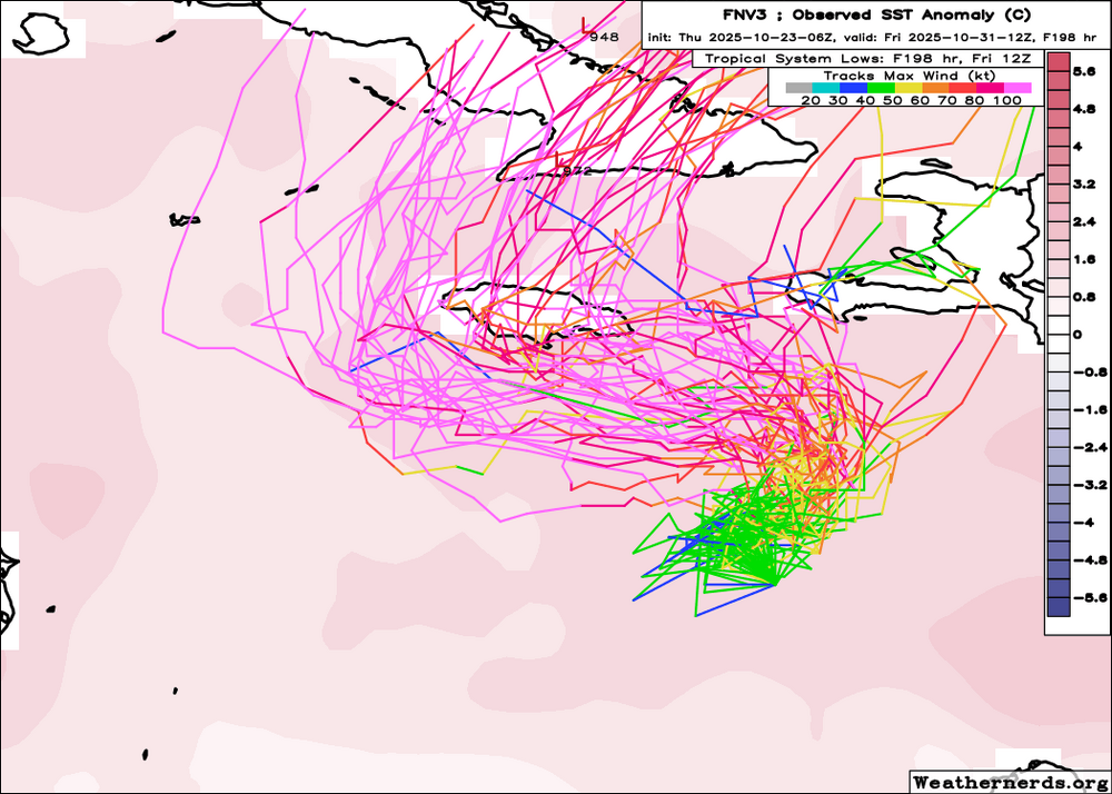There has been a northeast shift on the models overnight. The Google DeepMind ensembles have come into much better agreement that Melissa will now get pulled northeastward first before it turns west. All of yesterday's tracks that went well southwest of Jamaica are gone.