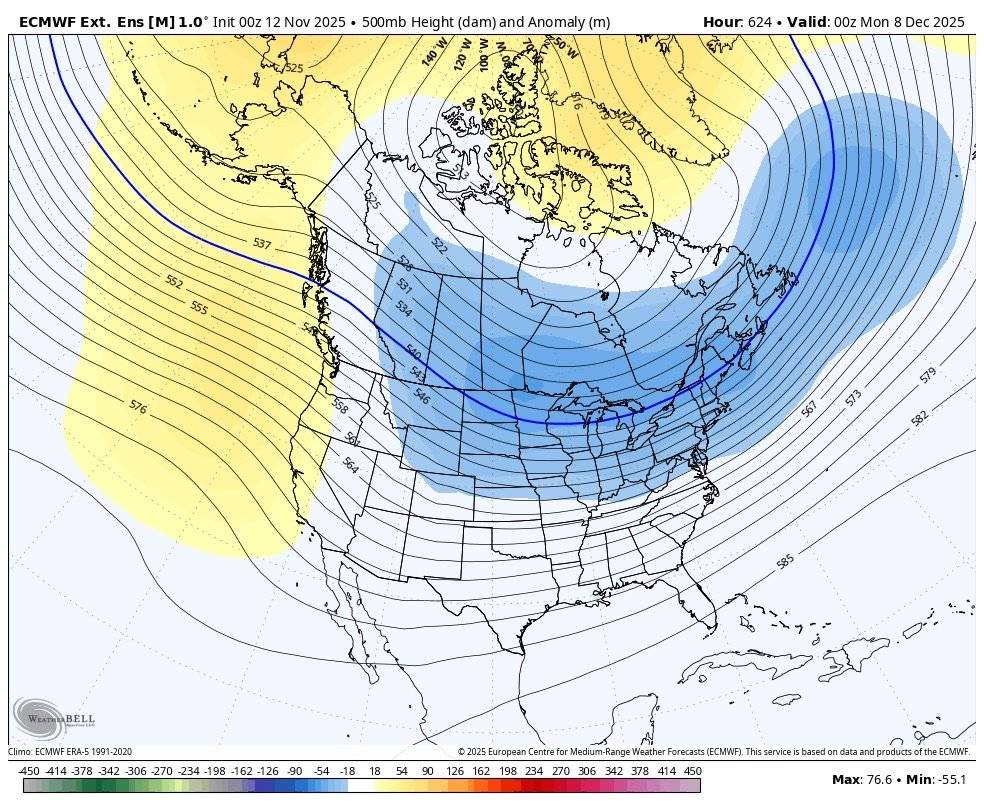 I don't foresee anything very different from the above, would just add that there may be potential for some heavy lake effect snowfall events and large temperature variations in the Midwest that could include a few episodes of near-record cold there. This makes me wonder if the snowfall anomaly will be highly positive in the upper Midwest trailing southwest and with a secondary maximum over the central Rockies. I think the east coast will be lucky to see one major coastal storm but could have a half dozen moderate snowfall events from redeveloping lows. -