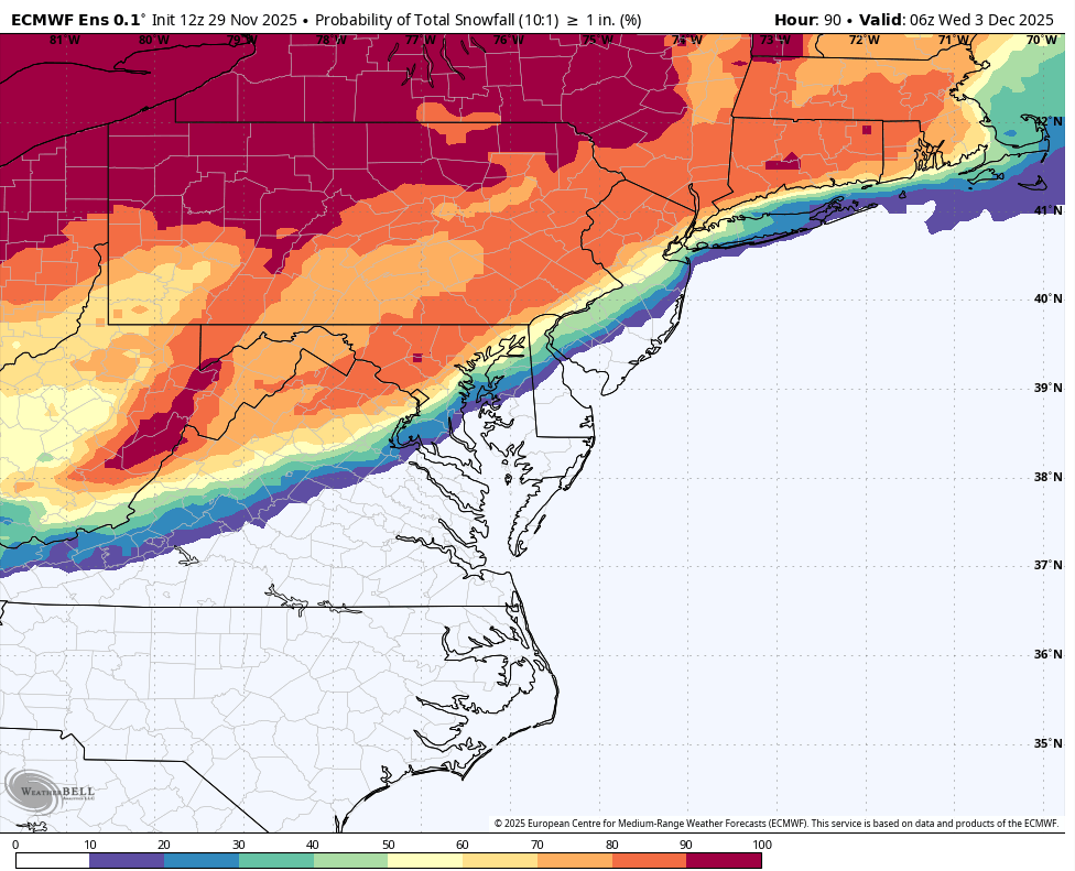 European ensemble snow greater than 1 inch probability has increased a bit at 12z with the 50% line down to Philly -