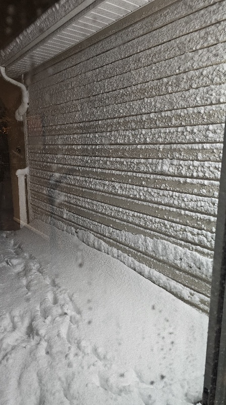 Magnolia 31F Windy blowing snow Snowing heavily Big flakes Even sticking to the side of the house and drifting
