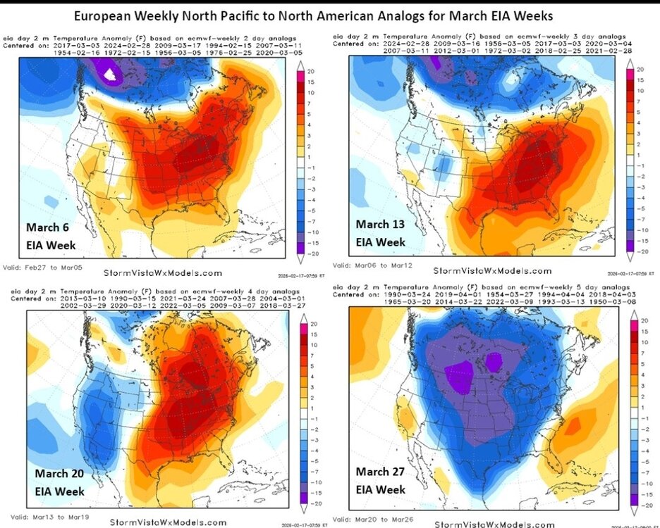 1. Note that the 2/22-23 snowstorm threat period remains mainly in phase 3, the coldest phase on avg during La Niña Febs. 2. When I calculate avg temperatures associated with each phase, I’m not assuming any lag. So, during La Niña, phase 3 was coldest on avg in Feb and phase 7 was coldest on avg in Mar, each with no lag. But also keep in mind that these are merely averages being the coldest along with spreads that cover MB to MA. For example: 1) For the coldest La Niña phase in Feb on avg, phase 3: Avg -107/73 days = -1.5, which is 4F colder than the La Niña Feb phase average of +2.5 and has easily averaged the coldest phase. Breakdown of the 18 different Feb La Nina phase 3 periods: wide range but more B/MB (7) than A/MA (5) MB: 1 B: 6 N: 6 A: 3 MA: 2 ————— 2) For the coldest La Niña phase in Mar on avg, phase 7: Avg -135/81 days = -1.7, which is 2.4F colder than the La Niña Mar average of +0.7 and has averaged the coldest phase. Breakdown of the 18 different Mar La Nina phase 7 periods: wide range but more B/MB (8) than A/MA (6) MB: 2 B: 6 N: 4 A: 3 MA: 3