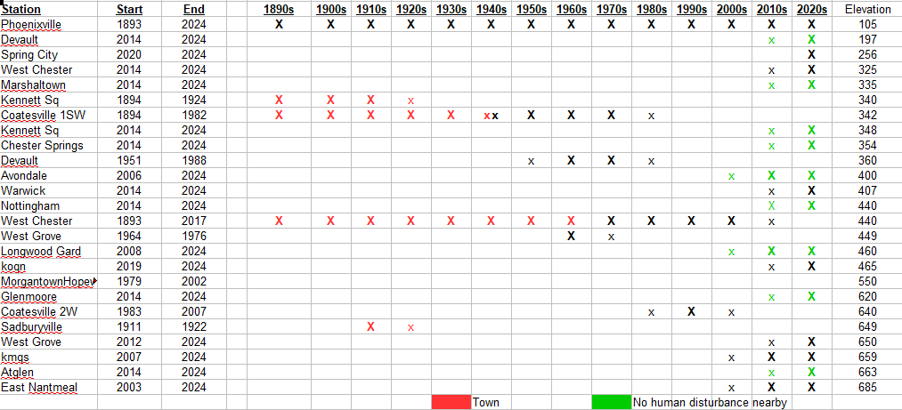 Reposting some of the charts I posted previously. Your line doesn't look anything like the raw data from individual stations. There is no significant difference in warming between individual Chester County stations and the Philadelphia Airport. Of course cooling station moves should be excluded. That's why the West Chester plot ends in 1969. Per the table below, there are big changes in the Chester County station population that you aren't accounting for. In comparison, the Philadelphia airport heat island is mature and isn't changing much from decade to decade. If heat island is important, why ignore the movement of Chester County stations out of towns after World War II? -