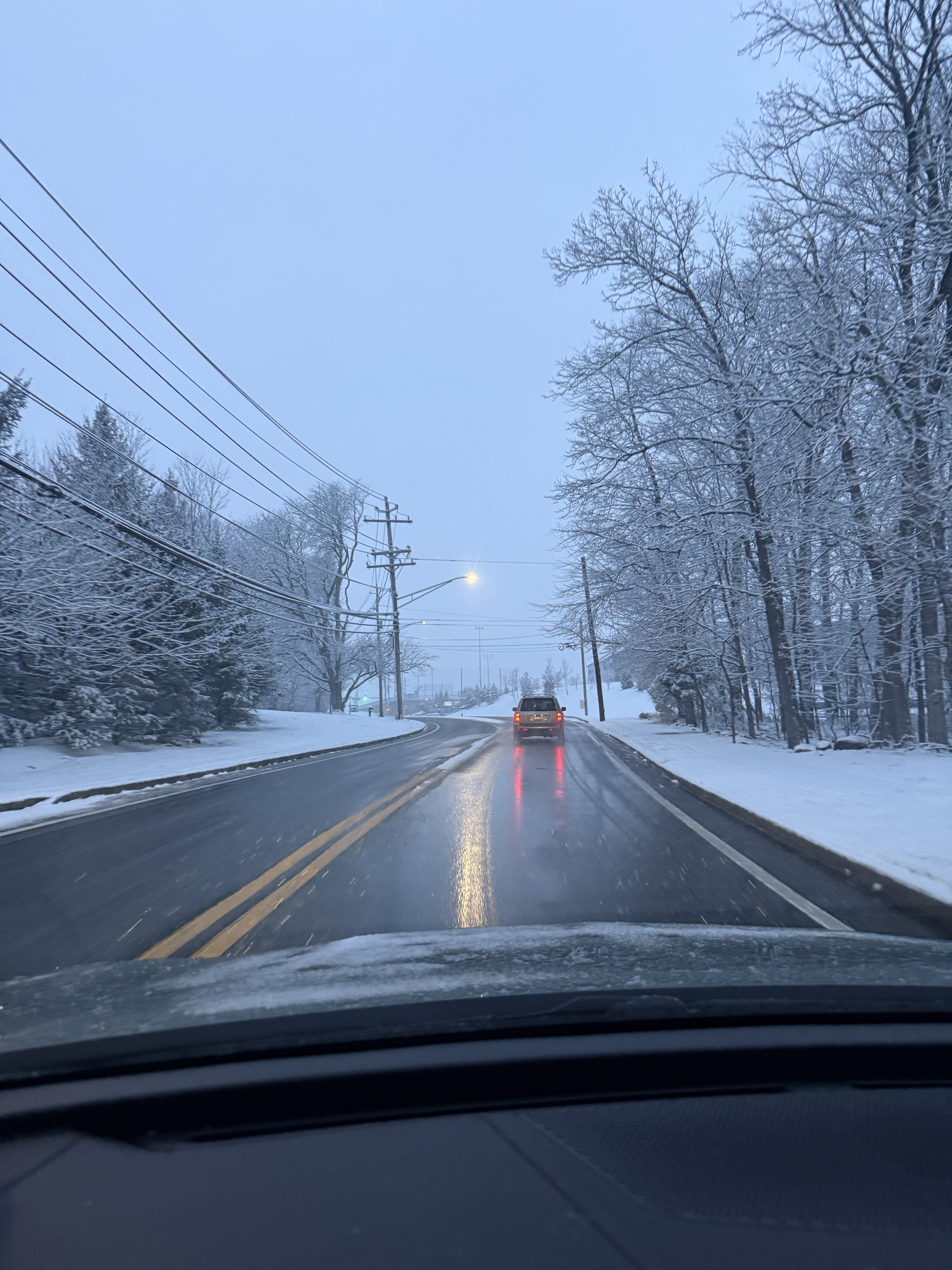 Started snowing about 20 minutes ago. Jeep is coated. Roads and sidewalks are a wet/white mixture. -