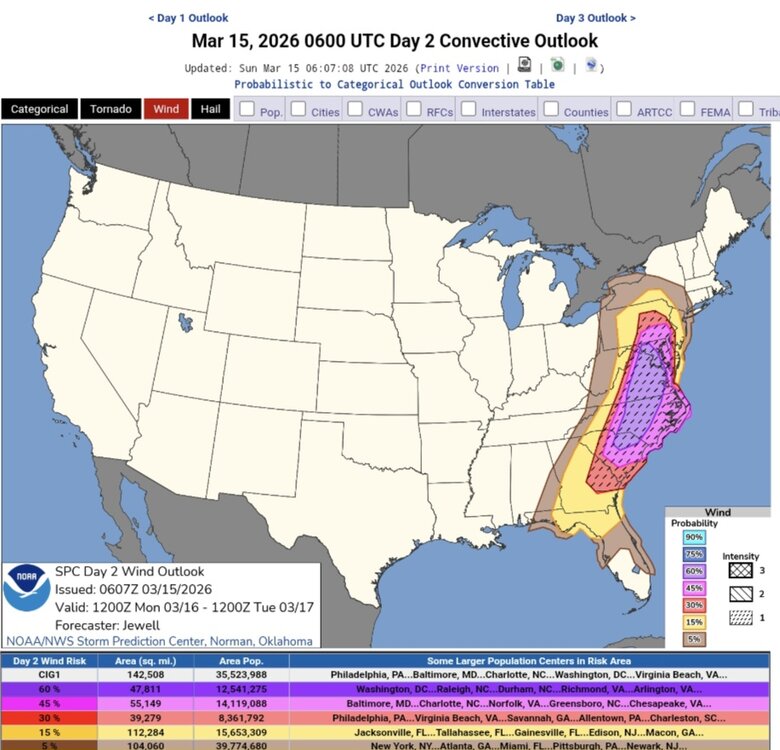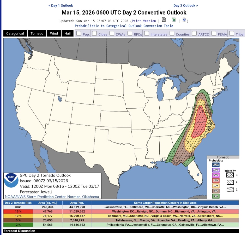 Day 2 Convective Outlook NWS Storm Prediction Center Norman OK 0107 AM CDT Sun Mar 15 2026 Valid 161200Z - 171200Z ...THERE IS A MODERATE RISK OF SEVERE THUNDERSTORMS FROM NORTHERN SOUTH CAROLINA ACROSS NORTH CAROLINA AND INTO VIRGINIA AND MARYLAND... ...SUMMARY... Widespread severe storms are forecast on Monday for parts of the Mid-Atlantic States and Southeast. Tornadoes, potentially strong, and particularly damaging winds are most likely from South Carolina into Maryland during the afternoon. Significant severe storm potential overall will extend from eastern Georgia/Florida Panhandle into Pennsylvania. ...Synopsis... A large and deepening upper trough will pivot northeastward out of the OH/TN Valleys, across the Appalachians and into the Mid Atlantic on Monday, while a surface low deepens into southern Quebec. A sharp pre-frontal trough will extend southward across NY, PA, and into the Carolinas/GA by late afternoon, with a corridor of significant pressure falls timed with the diurnal heating maximum. A cold front will push rapidly east across GA and the FL Panhandle during the day with a bit slower progress across the Piedmont and into PA. Gusty south winds ahead of the cold front will maintain 60s F dewpoints across the entire region, and as far north as southern PA, just after warm front passage by late afternoon. Just above the surface, southerly 850 mb winds will increase from 50 to 75 kt, resulting in extreme shear profiles over a large area. Large-scale ascent and shear will increase coincident with the peak heating hours, resulting in a potentially widespread severe weather event during the afternoon. ...From Georgia and the Florida Panhandle... Early day storms may be ongoing from the southern Appalachians toward the FL Panhandle Monday morning, and the environment will already be favorable for supercells including tornado potential. Forecast soundings indicate substantial instability with mid to perhaps upper 60s F along with ample shear. These storms may also produce hail, as midlevel lapse rates approach 7 C/km. ...Carolinas into MD/PA and vicinity... Areas of showers may occur early in the day especially but should rapidly lift north, allowing areas of heating and gradual destabilization over the entire area. As the surface trough deepens, low-level wind will back and strengthen throughout the day. Supercells producing tornadoes appear most likely ahead of the cold front from SC into NC and southern VA. Models vary with degree of instability, but strong tornadoes do appear possible with effective SRH of at least 300-400 m2/s2. Fast storm motions over 50 kt suggest a long tracked tornado will be possible. Meanwhile, a robust line of storms will develop as the cold front pushes east, stretching from the Carolinas to southern NY. With a moist air mass and large-scale support, this line is expected to produce particularly damaging winds, along with QLCS tornadoes across the remainder of SC/NC, VA, MD, and much of southern PA. This will likely peak during the late afternoon hours. The activity may eventually interact with cool trajectories off the Atlantic during the evening. ..Jewell.. 03/15/2026
