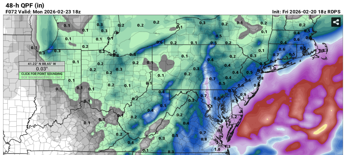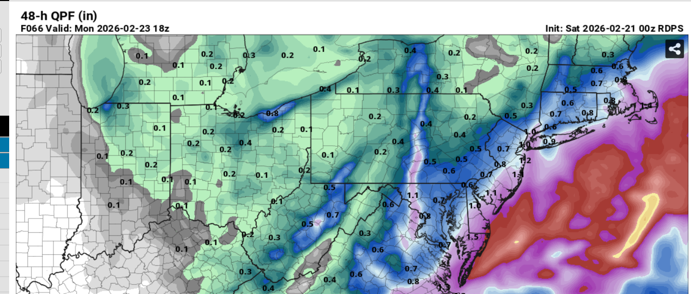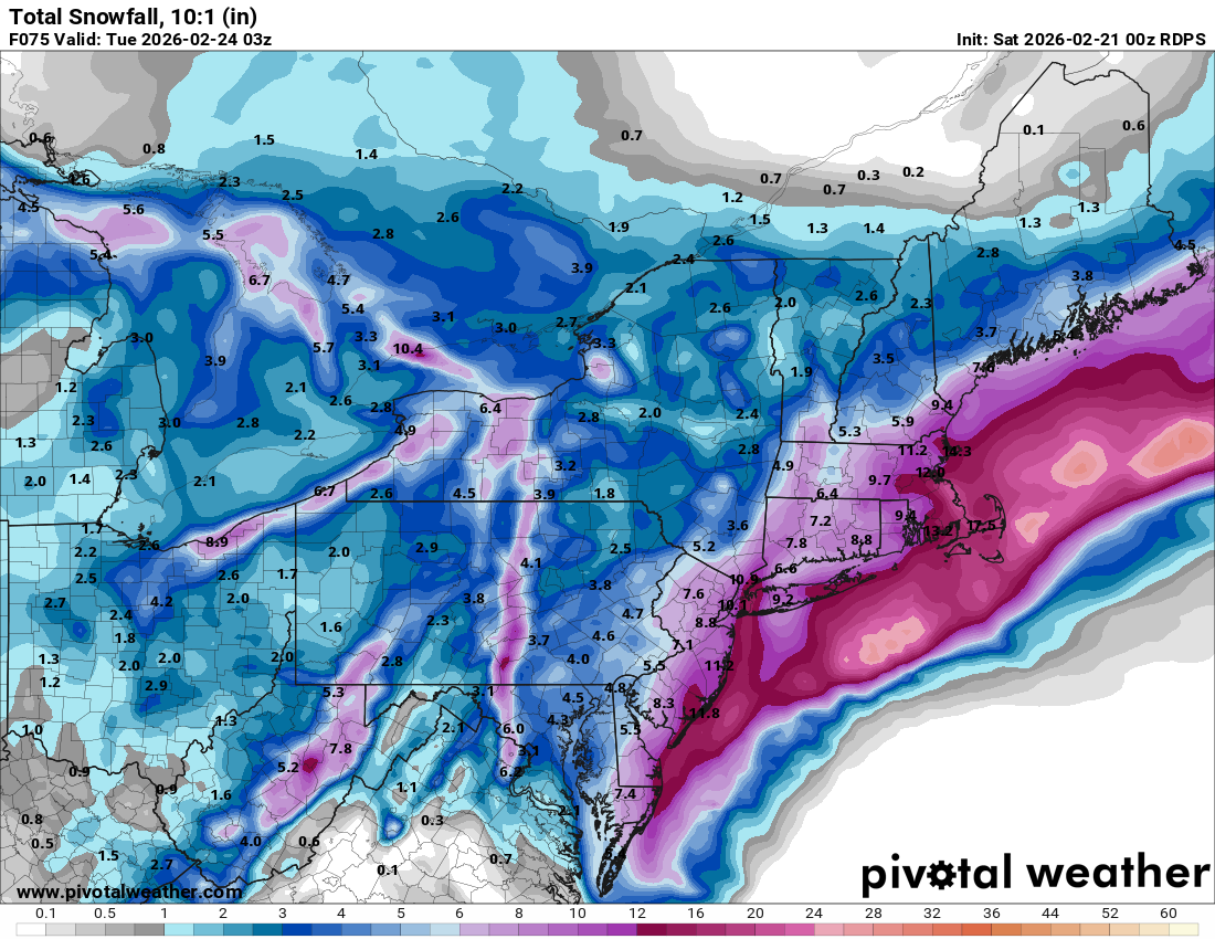2/21 00z RRFS (planned to replace HRR / Fv3 at some point) Total QPF 2/22 - 2/23-24 Snow 10:1