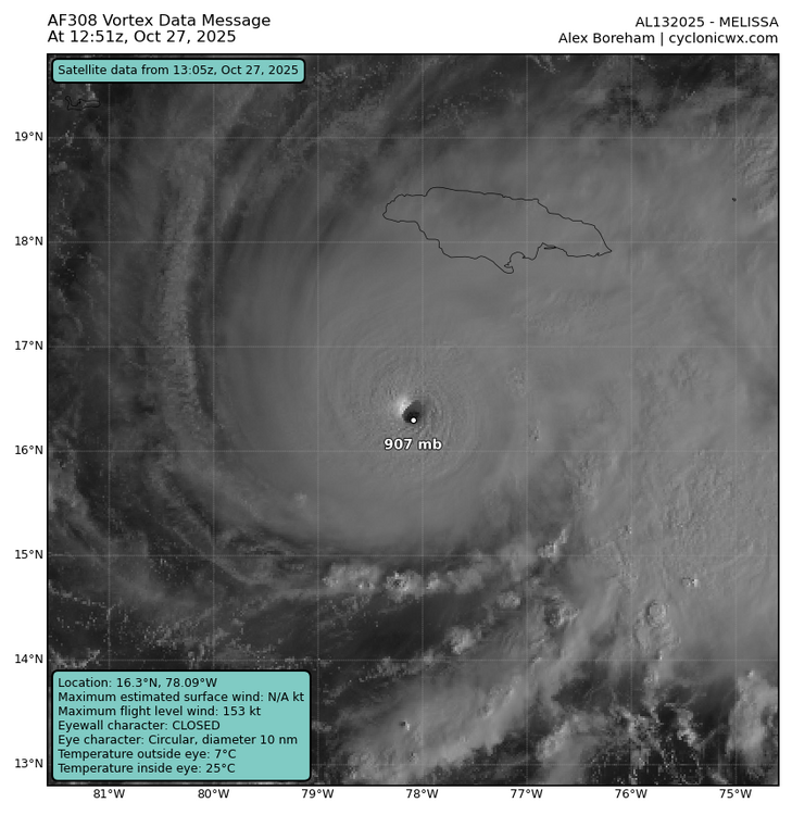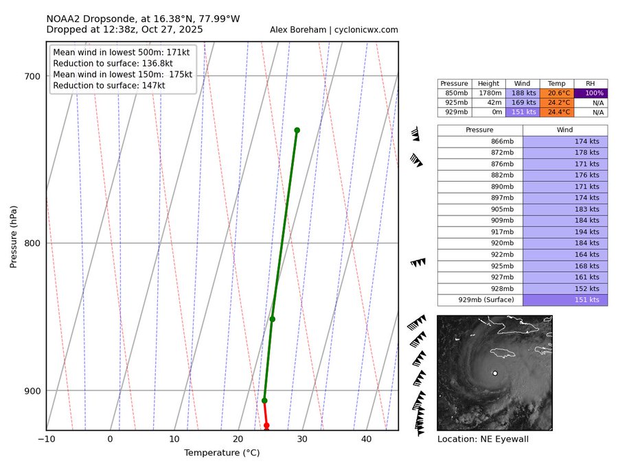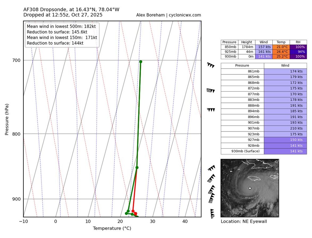 WOW!!! Between passes, gusts go from 194kts to 210kts. In the more recent dropsonde, notice how the temperature and dewpoint lines zigzag at the bottom. This means the dropsonde rotated and touched all 4 quads of the eye. Melissa is in extremely rare air, officially the 3rd highest gusts ever recorded by recon hunters.