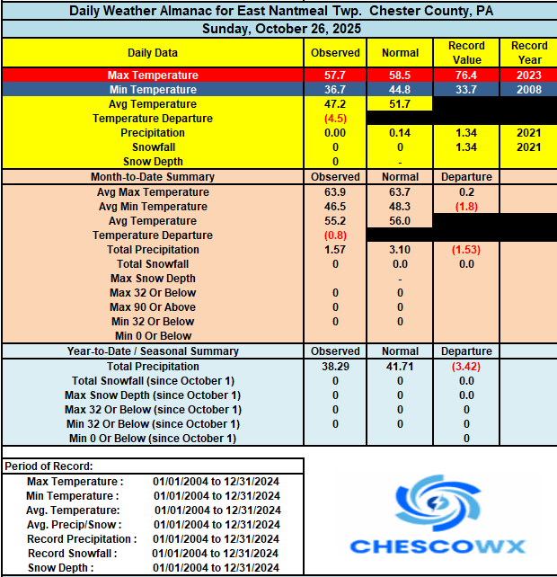 Some lower spots across the area saw lows in the 20's with Warwick the chilliest spot at 26.4 degrees. Here just a few miles south of there the low was almost 12 degrees warmer at 38.2. We should continue with below normal temperatures for at least the next week. The big weather story will be the beneficial rainstorm that looks likely to arrive by Wednesday evening and continue into Friday morning before clearing out in time for the trick or treaters on Halloween. This could be our most significant general rain event since the end of July. Some models are showing as much as 2 inches for many areas. -