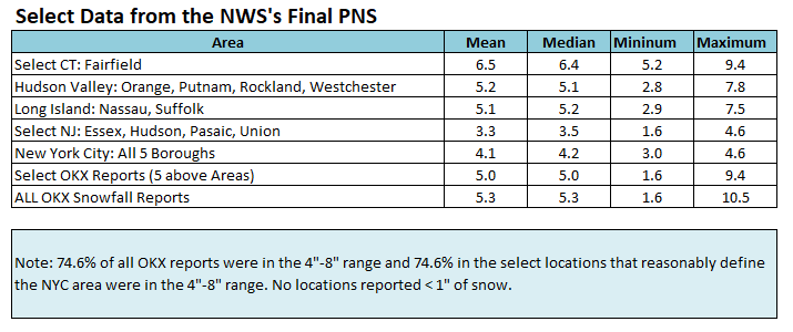 I had used the initial map posted by MJO812 for the benchmark. Even with the adjustment for the the additional snowfall, the outcome changes very little. The NAM has had successes. This wasn't one around the New York City area, which was the focus of the discussion/model comparison, when it came to snowfall amounts leading up to the storm. The HRRR overdid some of the totals for New York City and Newark. It seems to have a cold bias. In the end, over several days of guidance, it was clear that this was going to be a 3"-6"/4"-8" storm for the New York City area. There was no real drama for this area. The RRFS A's attempts at suppression, NAM's swings/amounts for NYC-EWR, and GFS's elevated amounts were noise. IMO, this was probably among the more straightforward forecasting situations in recent snowstorms for the City and its nearby suburbs. That outcome shows up well in NWS-New York's (OKX's) final PNS report where almost 75% of all snowfall reports fell in the 4"-8" range and nearly two-thirds were in the 3"-6" range. This will be my last comment on the NAM for the December 26-27 storm. The numbers speak for themselves.
