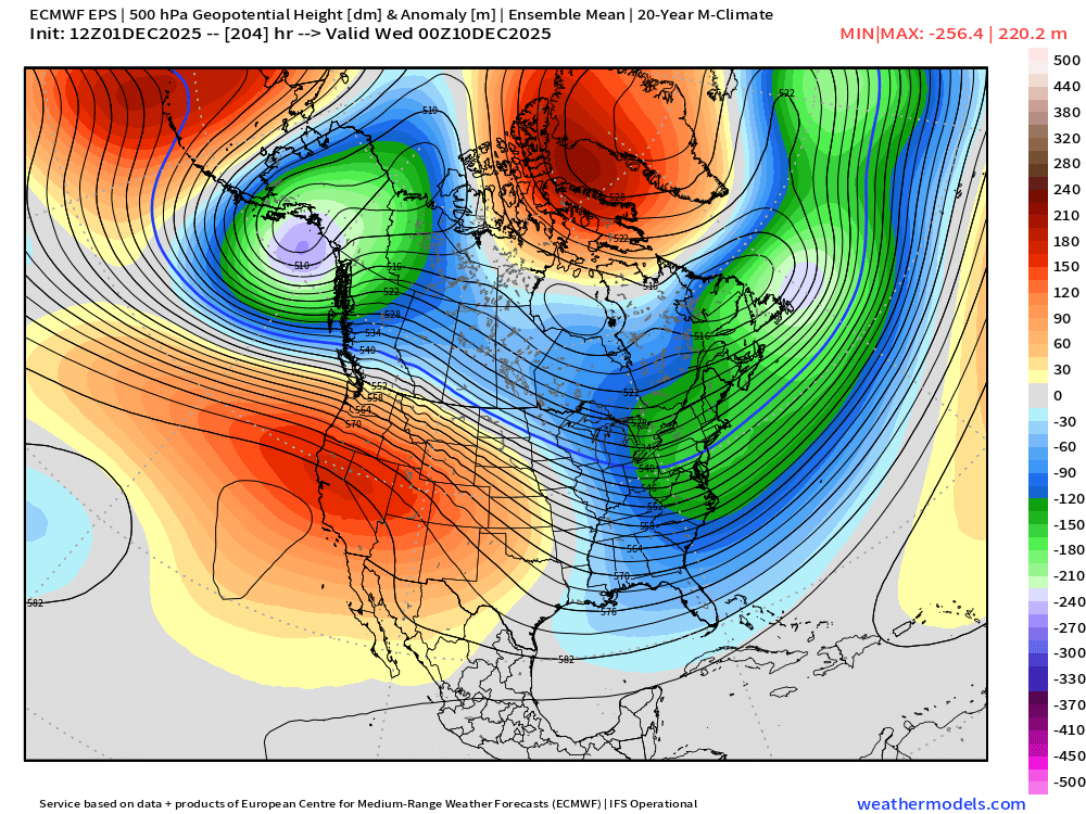 EPS is def more aggressive than other guidance trying to get a few inches in here on Saturday. A potential bigger threat would be middle of next week around the 10th-11th....but that one is all over the place. Lets see if we can amplify that ridge a little more out west....because we have a nice -NAO and some low heights in SE Canada which bodes well for actually trying to hold a high in place.