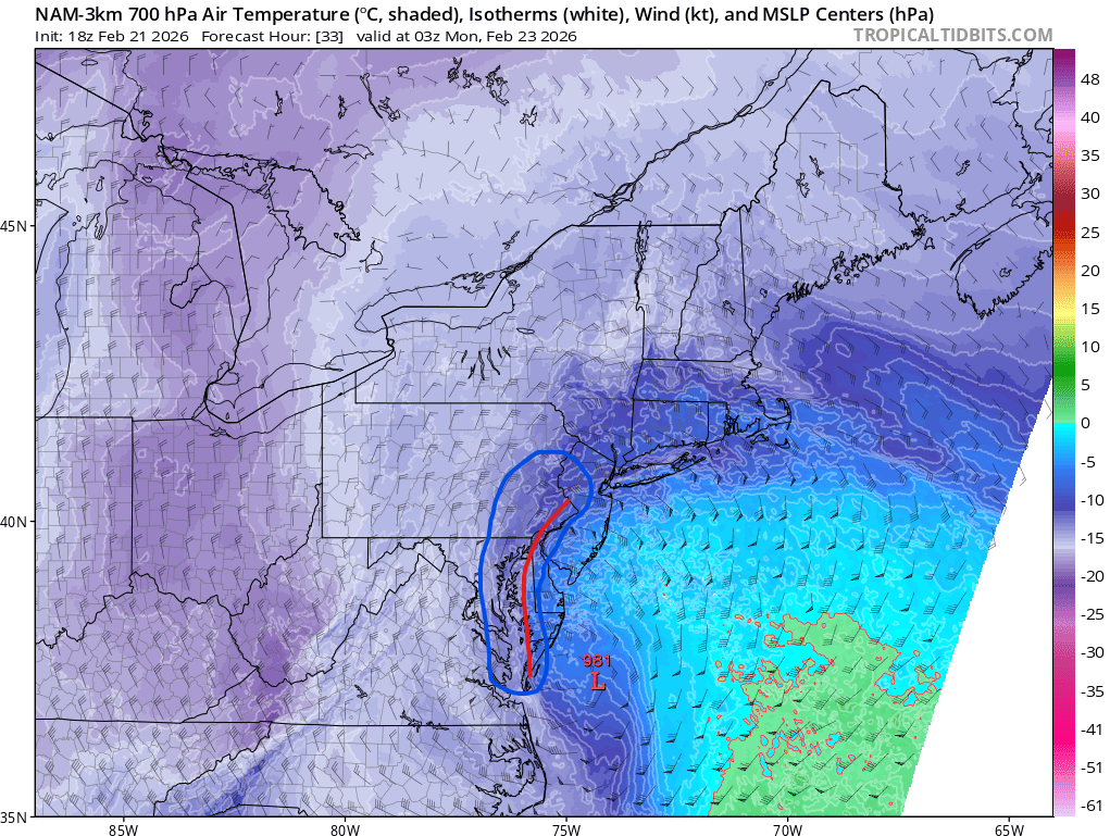 WB 6Z HRRR low stalls off Delmarva, intensifies, and slowly slides East. Showing 9pm and 1am positions. Winds also a factor 20-50mph on the coast. Only thing keeping this from a crippling storm is surface temps which stay above freezing until 9-10 pm. If this is too warm, look out! -