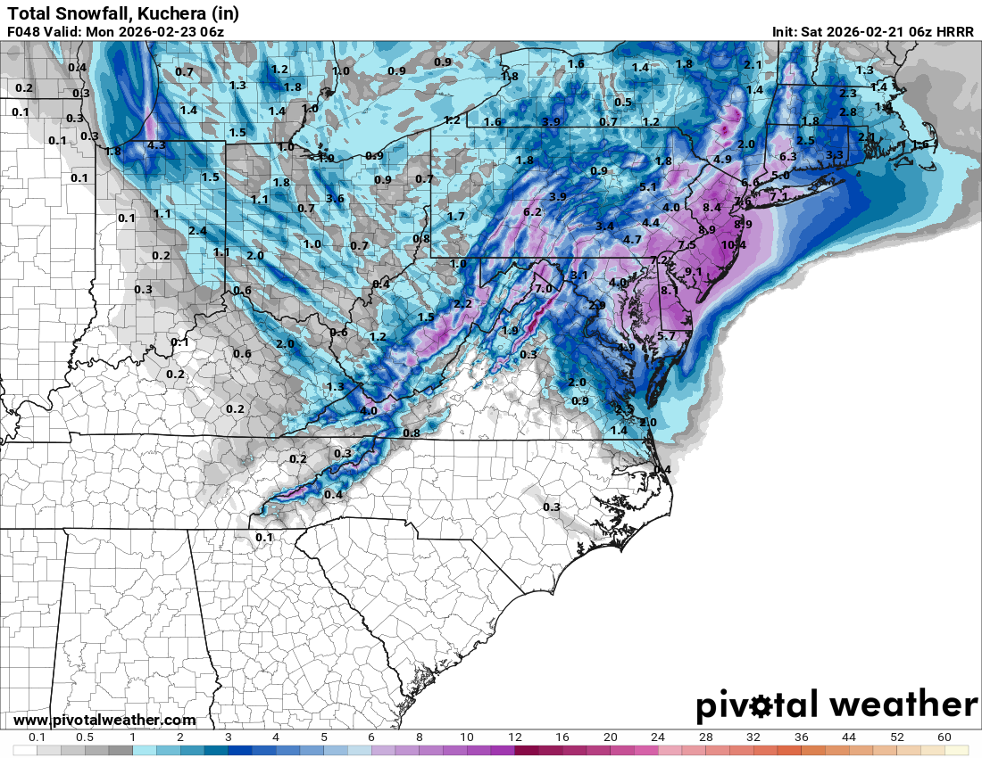 Ugh, just woke up after going down just before the GFS ran. Talk about swings. It's like watching a recorded game seeing your team up big at halftime, only to see it slipping away in the second half. Not jumping off the bandwagon yet, but gotta hope certain aspects of the ECMWF and AIFS aren't gonna become trends. That's is, um, where did the inverted trough go per the EC camp? That and a weaker surface low father offshore? It's like the EC runs of a couple days ago all over again. And I have to tell you, the CMC/GEM wasn't overly inspiring either, with the low farther offshore and much of our area in between the inverted trough band west and mega CCB band over the Eastern Shore. Lastly, the low over the VA Capes giving way to the new forming low off the NJ will need to be monitored. That can really screw with our totals. Remember a few winters back when Central Park had about 11" when they were supposed to get 2-3 feet (while areas east of them did)? That was the result of a similar quick transfer of energy. Not that 11" would be bad! But it was more than half less than what was anticipated. Damn this storm is littered with land mines. BTW 06Z HRRR Kuchera through 06Z Mon. Still showing..
