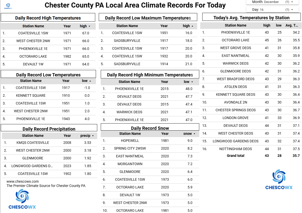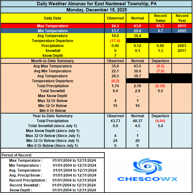 We had quite a few spots with lows in the single digits. The lowest was the 3.8 degrees at Warwick Township. The sun returns today and we should see some melting of the snow but with high temperatures remaining below freezing and the low sun angle it will be limited. Our much colder than normal December continues before we finally warm up to above normal on Thursday and Friday with rain arriving on Thursday night. Expect some fog over the melting snow with this system and most of the snow cover will be gone by Friday morning. Rain amounts could approach an inch in some spots. Looking ahead to Christmas week temperatures look to be not too far from normal for Christmas, but chances of a White Christmas look slim. -